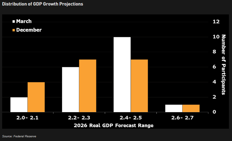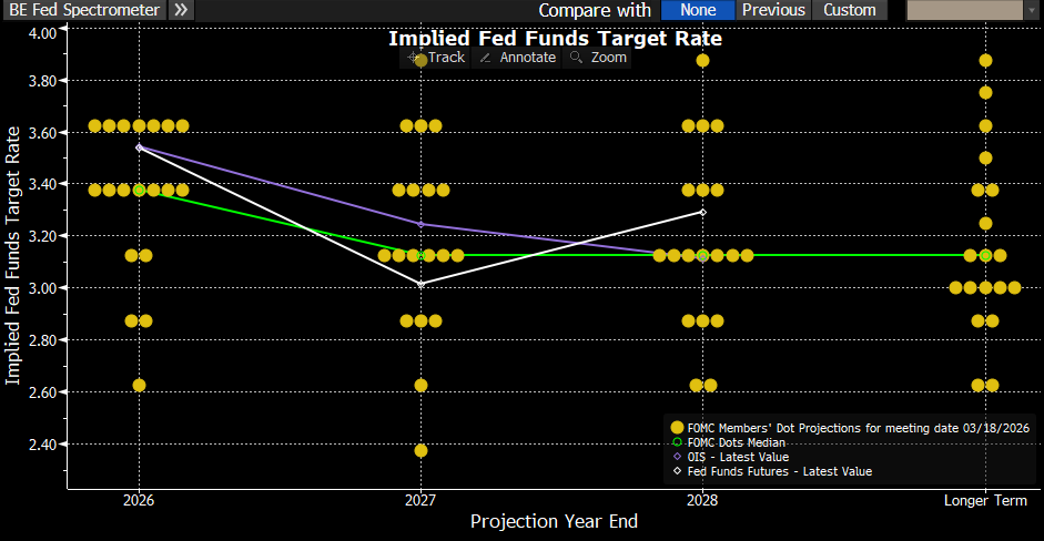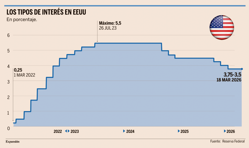 La Fed mantuvo este miércoles los tipos de interés sin cambios en el 3,5%-3,75%, aunque, de nuevo, la decisión no fue unánime, y también mantuvo su visión de que durante el año habrá una rebaja de 25 puntos básicos, como se anticipó en la reunión de Diciembre del 2025. Sin embargo, elevó su previsión de crecimiento al 2,4% en 2026 y 2,3% en 2027, en parte por efecto arrastre de 2025, en parte por esperar una mayor productividad asociado a la IA. No obstante, ha venido acompañado de una previsión de inflación superior, la Fed espera una inflación del 2,7% en 2026 y del 2,2% en 2027. Sobre la guerra, el presidente de la Fed señaló que ahora mismo la incertidumbre impide saber qué impacto tendrá en Estados Unidos, pero que no será positivo y afectará a la inflación, estando la institución preparada para responder. La Fed también mantuvo inalterado el “dot plot” respecto al de Diciembre del 25, estimando un recorte de tipos en 2026, hasta el 3,375%, y otro en 2027 a 3,125%, nivel que se mantendría a medio plazo, por lo que los recortes siguen en la agenda, apoyando al objetivo de empleo y en tanto en cuanto aún están en niveles ligeramente restrictivos, aunque con retrasos, antes del conflicto se esperaban 2 recortes en 2026, el primero en julio y el segundo en diciembre.