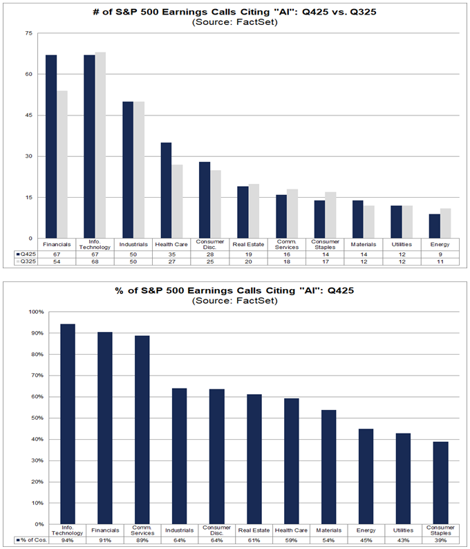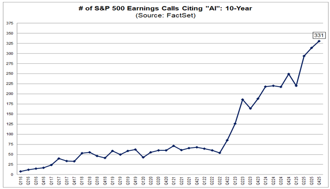 Interesante referencia de Facset analizando los resultados del cuarto trimestre del 2025, 331 compañías del S&P 500 hicieron mención a la Inteligencia Artificial en sus llamadas de resultados del 4T25, frente a las 50 compañías que lo hicieron en los resultados del 3T25 (FactSet Insight – Commentary and research from our desk to yours | Earnings).