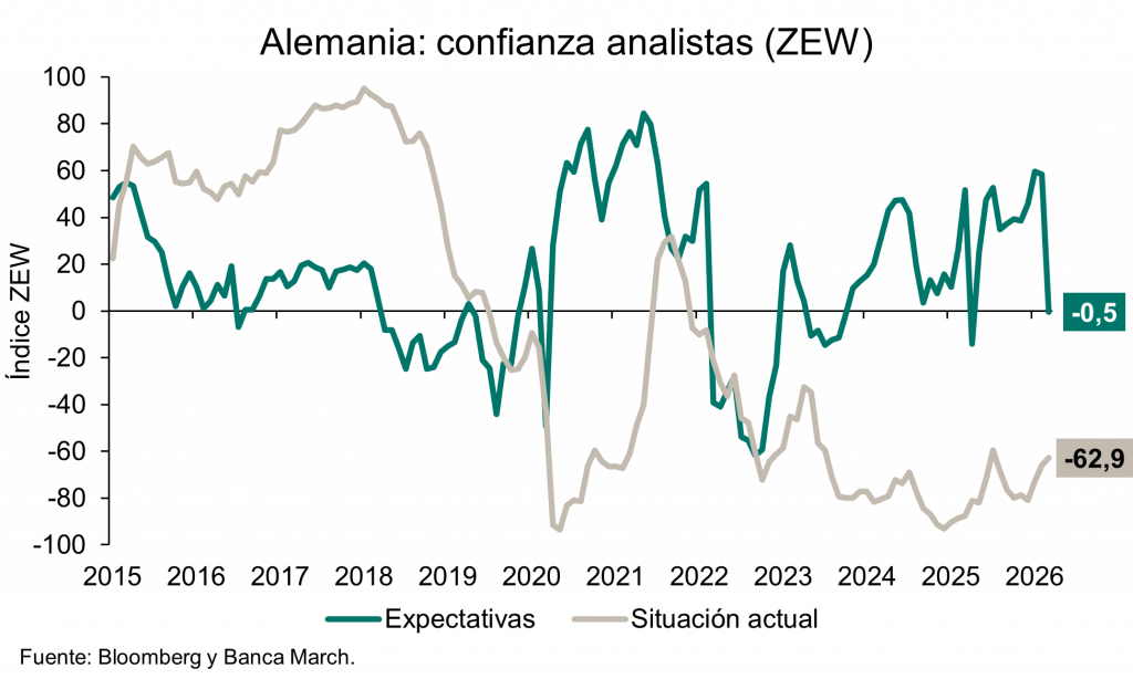 El miércoles se publicó en Alemania la confianza de los analistas e inversores institucionales de marzo, que decepcionó. Según el índice ZEW, la confianza bajó hasta el -0,5 desde el 58,3 previo, unos niveles no vistos desde abril, después del Día de la Liberación. Como telón de fondo, el conflicto en Oriente Medio y el correspondiente encarecimiento de la energía han eclipsado parcialmente las expectativas de recuperación del país germano, que en los próximos meses se verá beneficiado del impulso fiscal derivado de los amplios planes de inversión en infraestructuras y defensa.