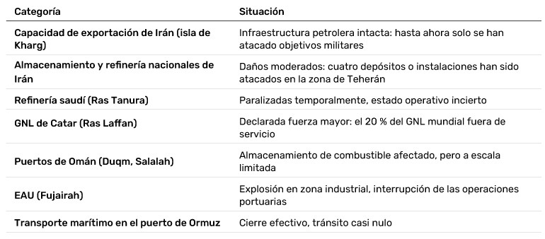 Los contraataques iraníes se han dirigido principalmente contra instalaciones militares, de comunicaciones y diplomáticas. Una parte significativa del petróleo que actualmente no está en circulación se debe simplemente al cierre de grifos debido a que el almacenamiento ha alcanzado su capacidad máxima y a la falta de rutas de salida del Golfo.