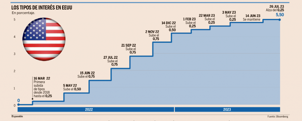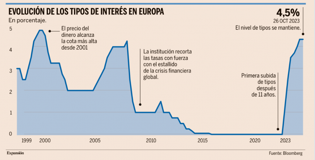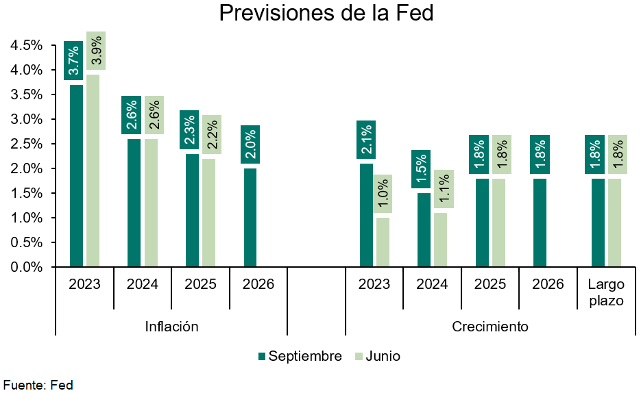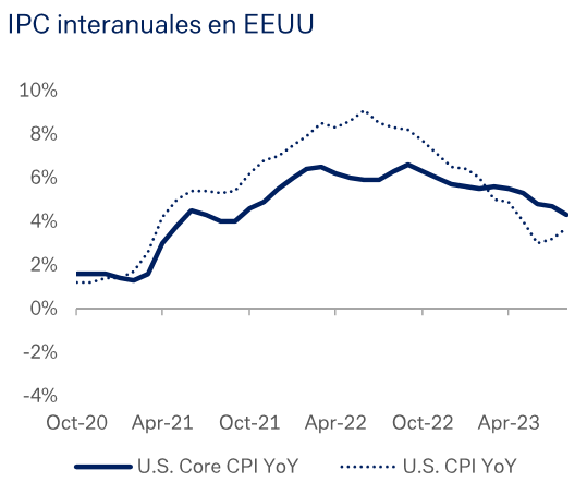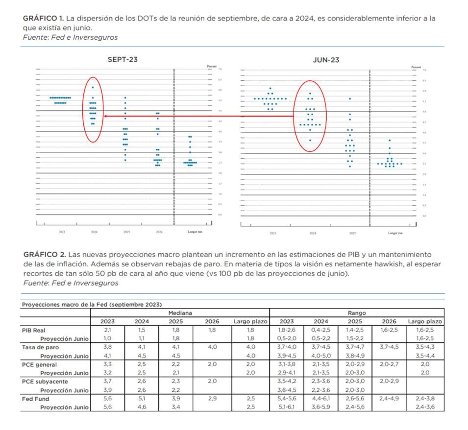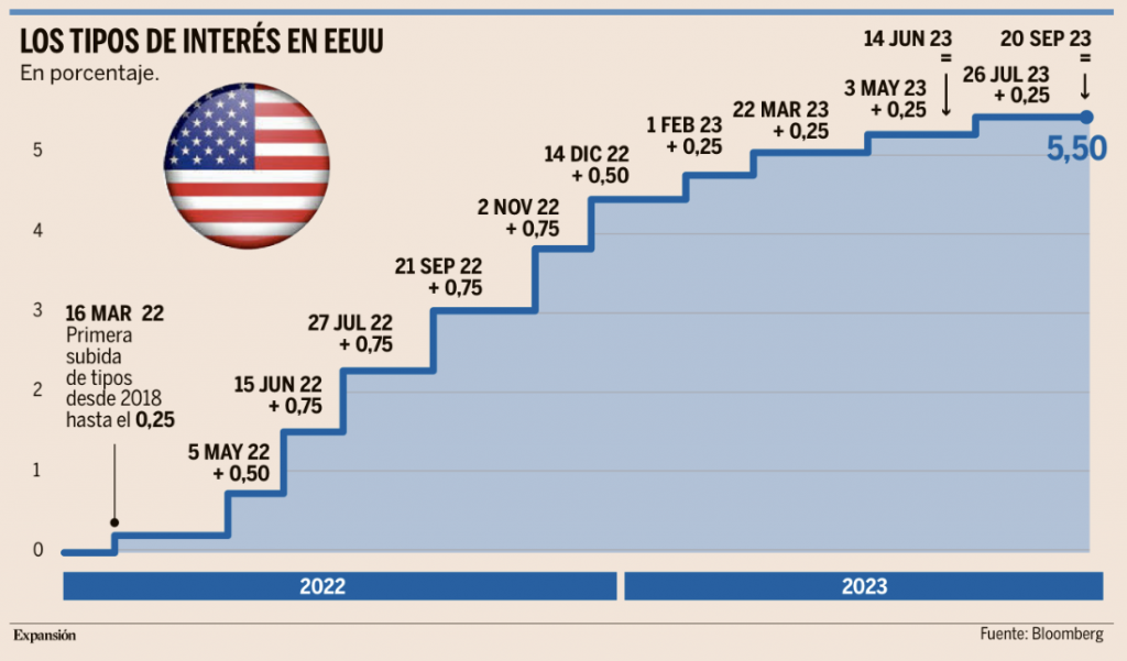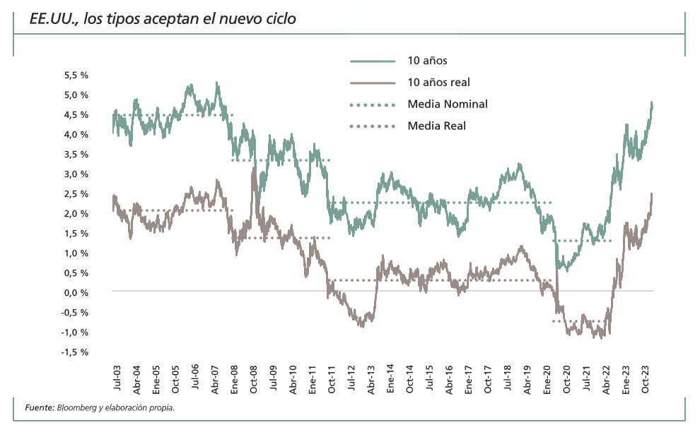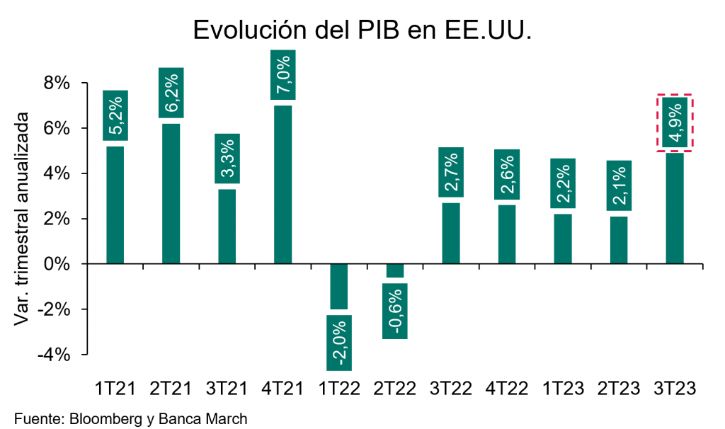 Como comentaba la semana pasada, la solidez demostrada por la economía estadounidense a pesar las agresivas subidas de tipos de interés (5,25%) respalda el hecho de que los tipos de interés se van a mantener altos durante más tiempo. Si, además, tenemos en cuenta el deterioro fiscal en Estados Unidos, que obliga a emitir volúmenes crecientes de deuda, muchos analistas creen que los tipos de interés a 10 años se van a mantener alrededor del 4,5% en los próximos 12 meses. Como decía ayer conocimos que el PIB de Estados Unidos subió en el tercer trimestre un 4,90% interanual frente al 4,50% que esperaba el consenso del mercado.
