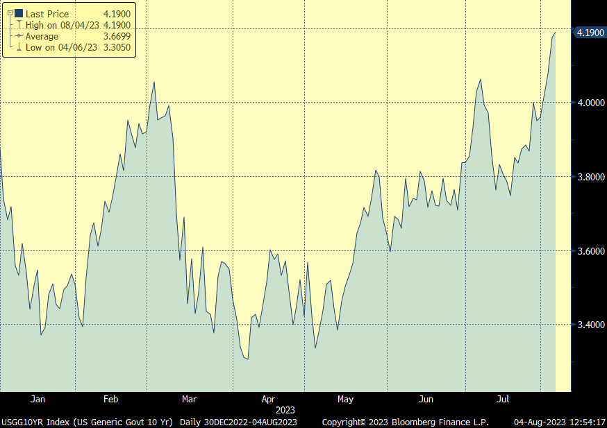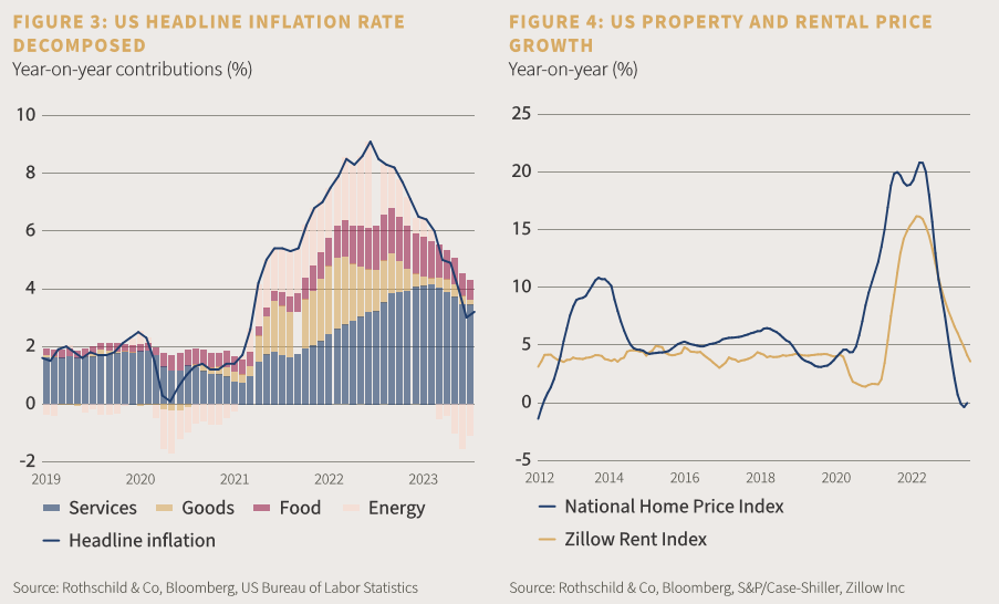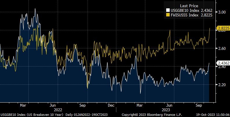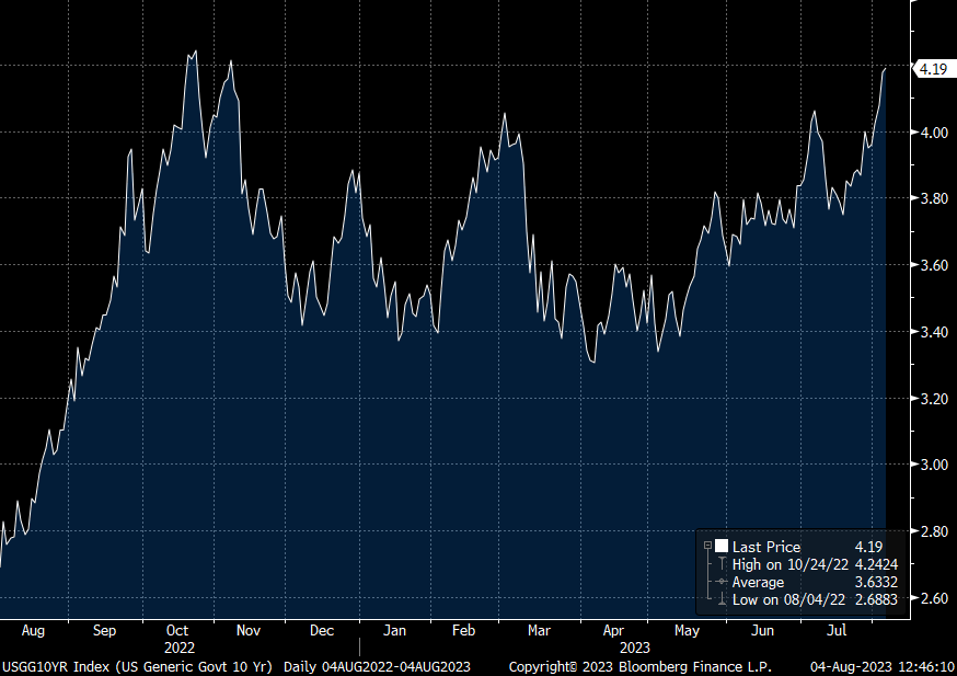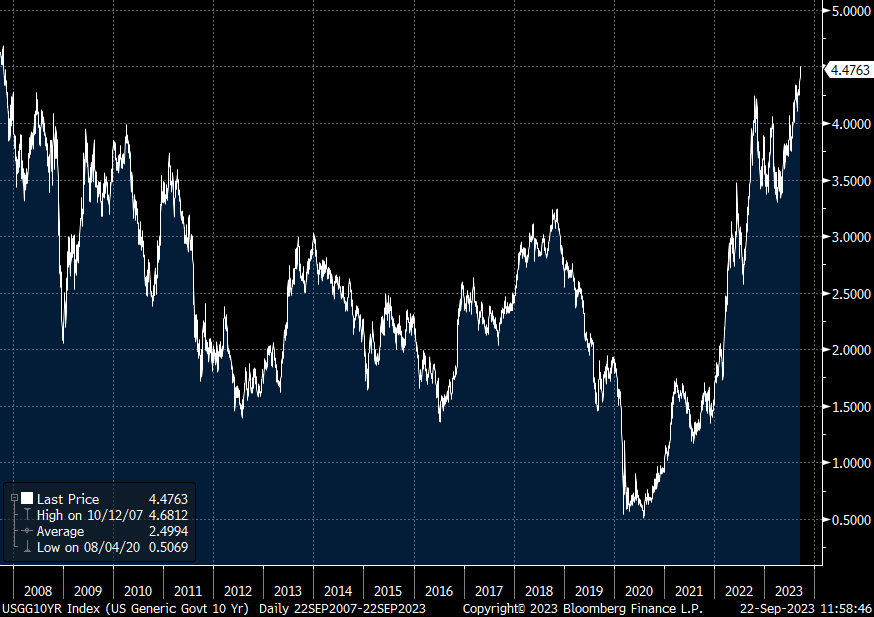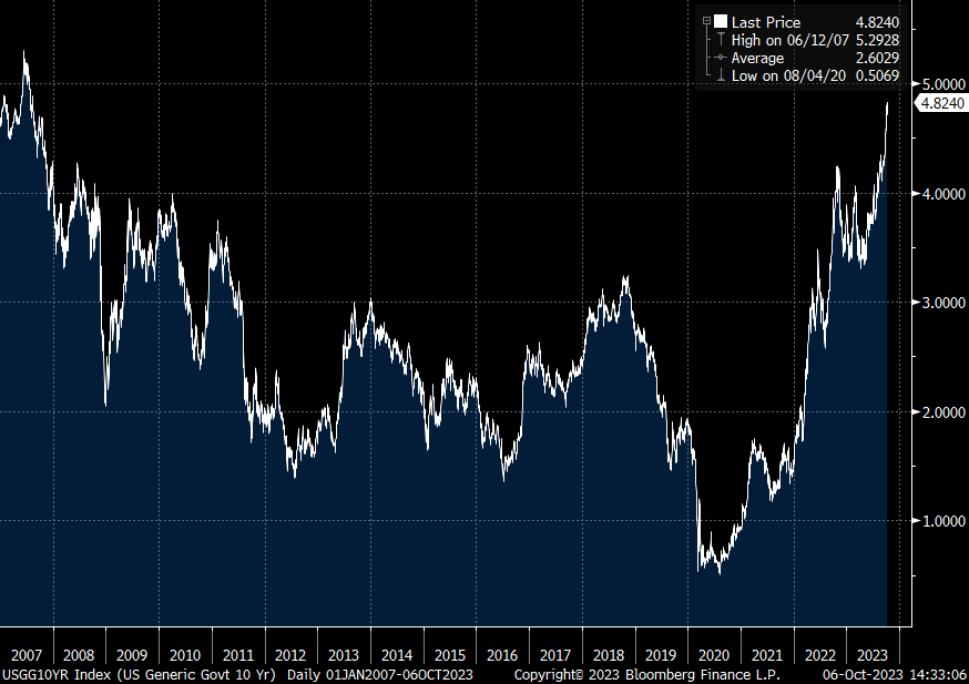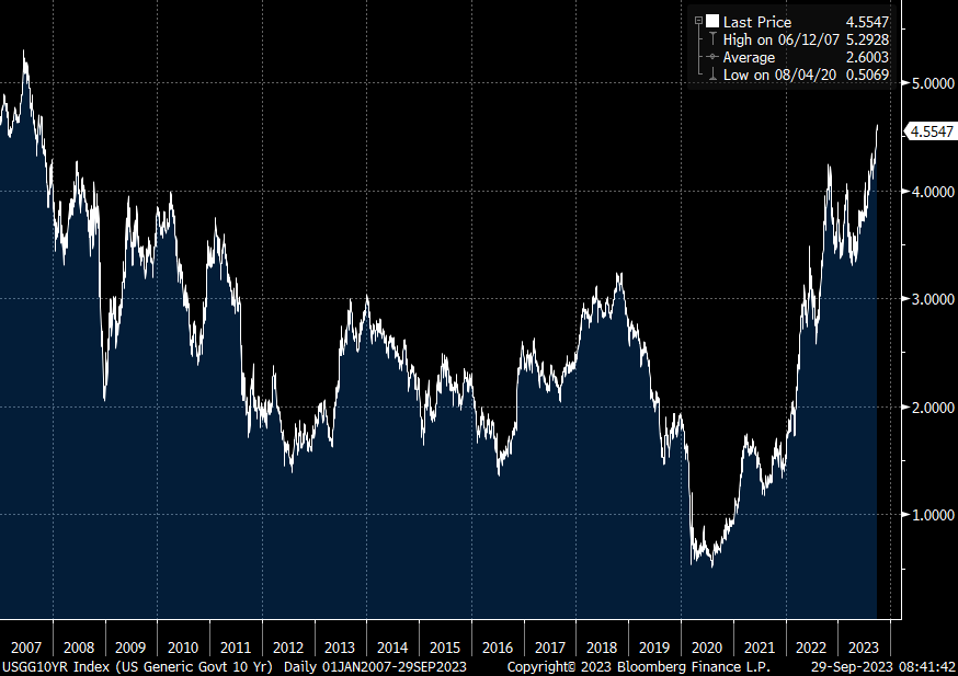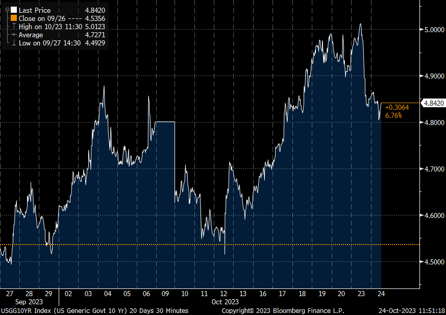 Como comentaba la semana pasada, la solidez demostrada por la economía estadounidense a pesar las agresivas subidas de tipos de interés (5,25%) respalda el hecho de que los tipos de interés se van a mantener altos durante más tiempo. Si, además, tenemos en cuenta el deterioro fiscal en Estados Unidos, que obliga a emitir volúmenes crecientes de deuda, muchos analistas creen que los tipos de interés a 10 años se van a mantener alrededor del 4,5% en los próximos 12 meses. Como decía ayer conocimos que el PIB de Estados Unidos subió en el tercer trimestre un 4,90% interanual frente al 4,50% que esperaba el consenso del mercado.