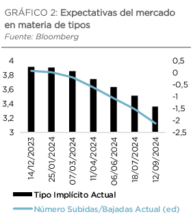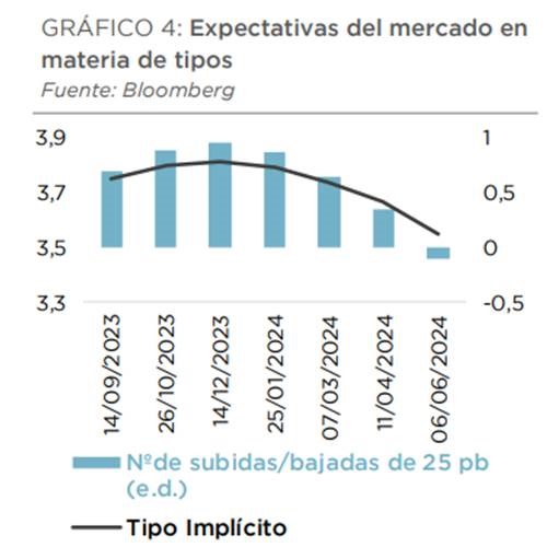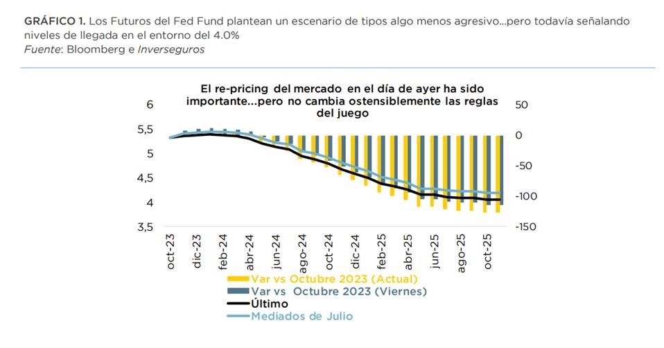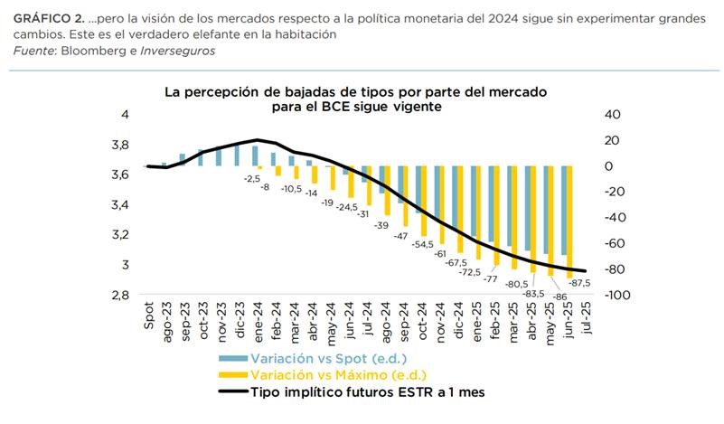 También ayer hubo reunión del Banco Central Europeo como esperaba la mayoría del consenso de analistas, el BCE mantuvo inalterados los tipos de interés de referencia. El BCE sigue insistiendo en que mantendrá los tipos en niveles suficientemente restrictivos hasta ver signos sostenidos de convergencia de la inflación al objetivo, reaccionando por tanto en función de los datos. En este sentido Lagarde reconoció que la inflación bajará en el corto plazo, pero que las presiones inflacionistas domésticas siguen fuertes, a lo que se suma ahora el contexto geopolítico incierto. La presidenta del BCE anunció que no se ha discutido la posibilidad de adelantar el final de las reinversiones del PEPP (Programa de compra de deuda activado con la pandemia) ni alterar el coeficiente de reservas mínimas.