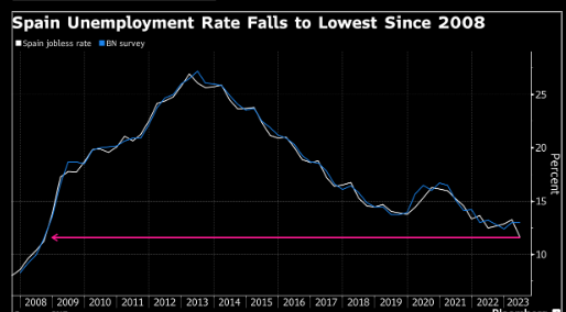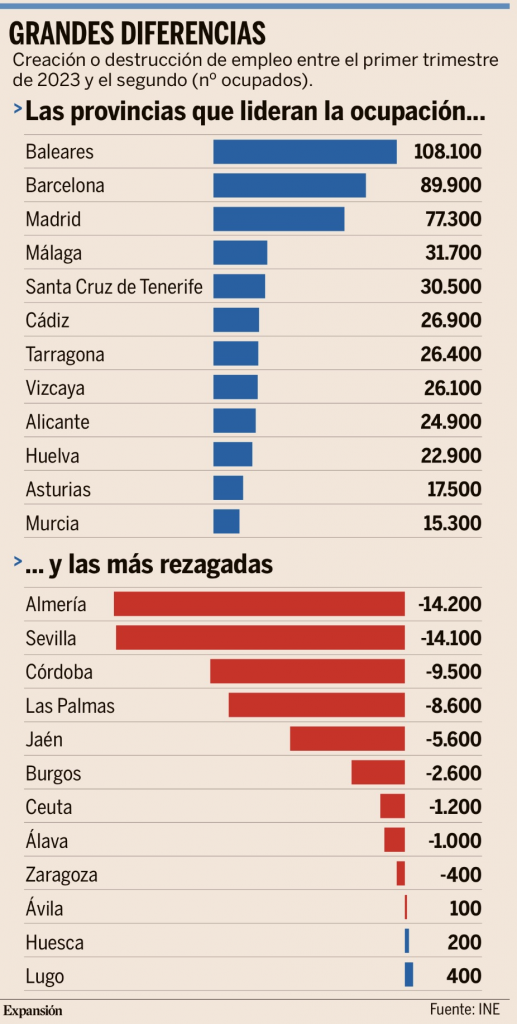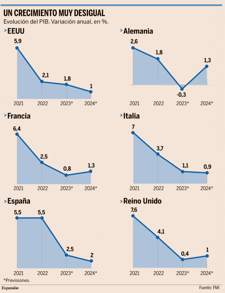Es el pronóstico más pesimista hasta la fecha entre los grandes organismos económicos. Hace dos semanas, el FMI recortó al 1,7% su previsión para 2024, mientras que el Banco de España espera un alza del 1,8% y Bruselas, del 1,9%. Esto es, España seguirá siendo una de las economías que más crezca, pero en un contexto de deterioro de la actividad y en el que “se prevé que el crecimiento del PIB (español) se desacelere”, señala la OCDE. Un crecimiento menguante que se sustentará en una demanda interna en declive, con un aumento del consumo privado del 1,7% este año y del 1,6% en 2024 (lejos del 7,1% y el 4,7% que creció en 2021 y 2022), en las “importantes entradas” de fondos europeos a la economía, aunque su efecto dependerá de la velocidad a la que se ejecuten, y en la resiliencia del mercado laboral, con un crecimiento del empleo que la OCDE ve “sólido” y que permitirá reducir el paro al 11,9% en 2023 y al 11,5% en 2024. Tibia mejora que no evitará que el paro en España siga siendo “el más alto de la OCDE”.
