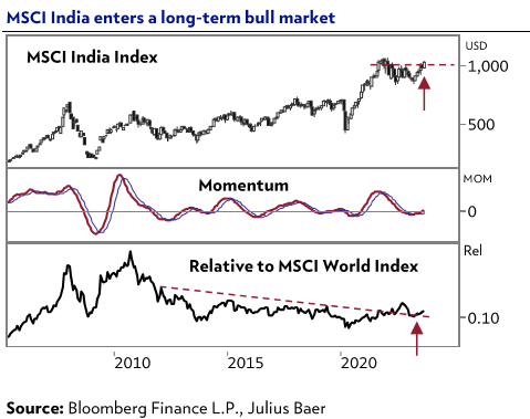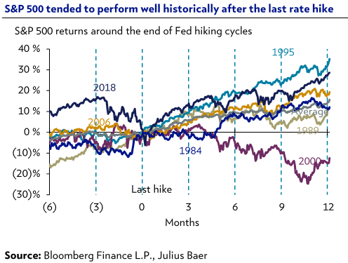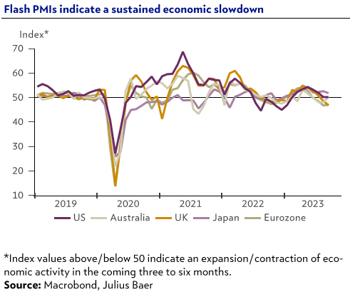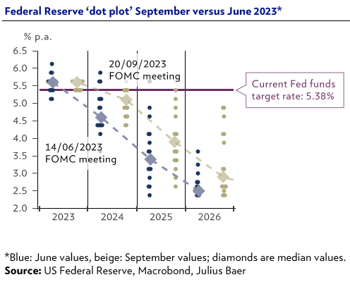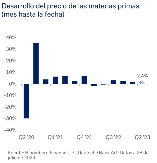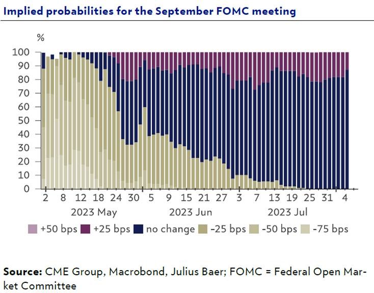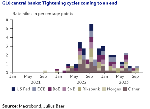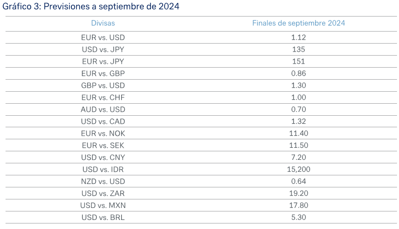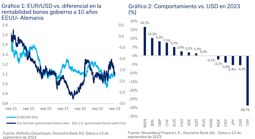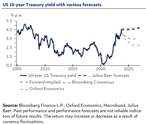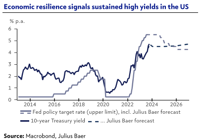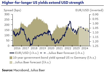 Según Julius Baer unos tipos de interés altos esperados durante más tiempo, así como el mejor comportamiento de la economía estadounidense en relación al resto del mundo, respaldan una apreciación del dólar. Hemos visto gran parte de este movimiento y Julius Baer espera que el eurodólar se sitúe en 1,04 a 3 meses.