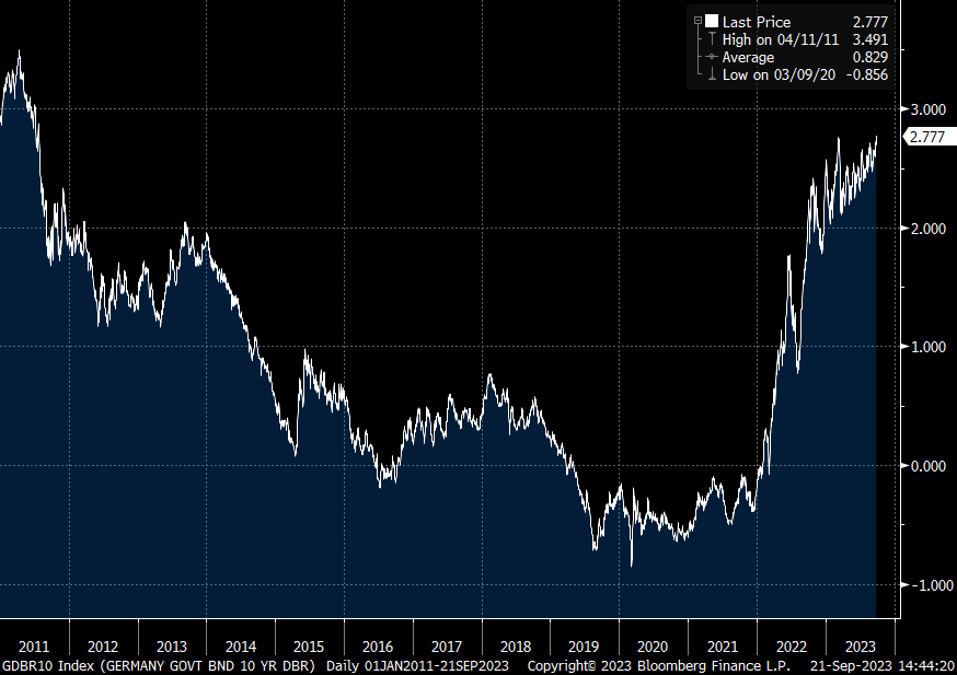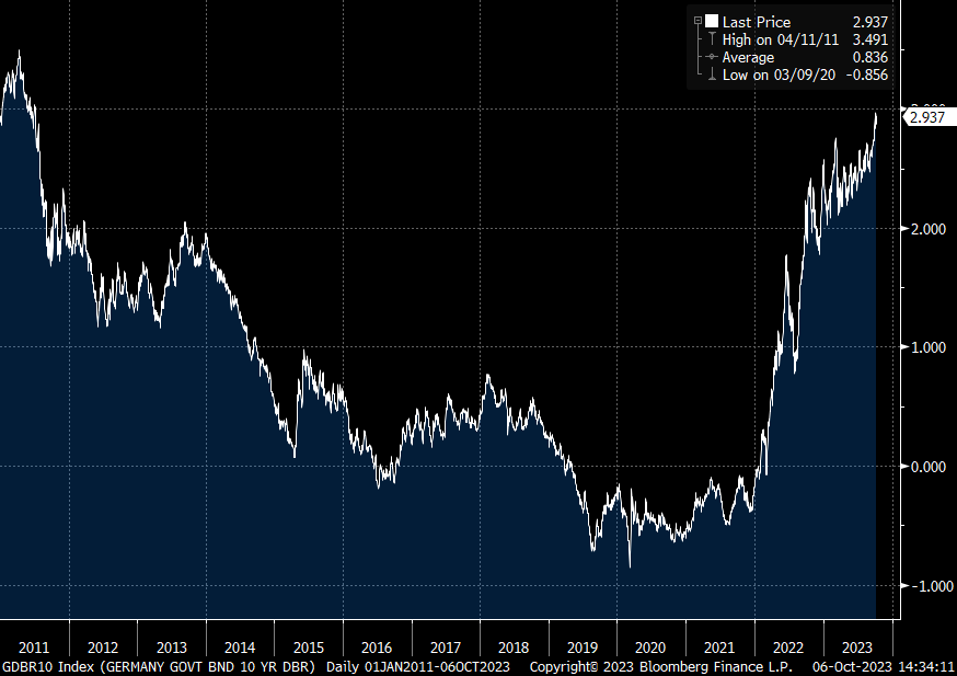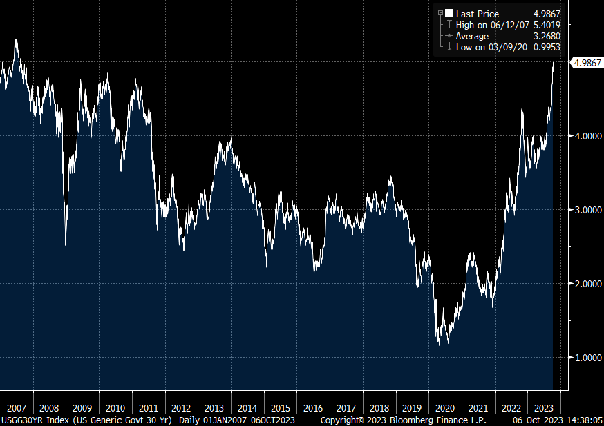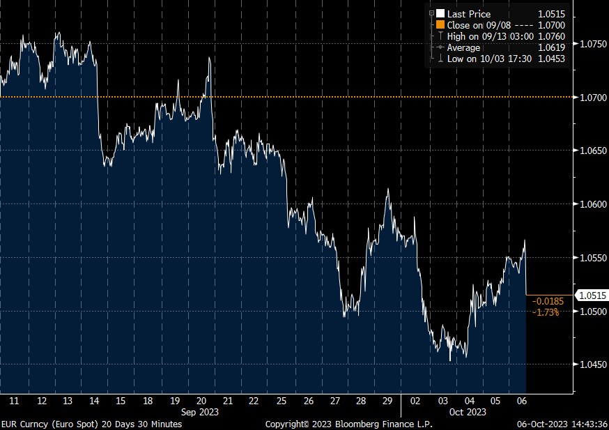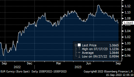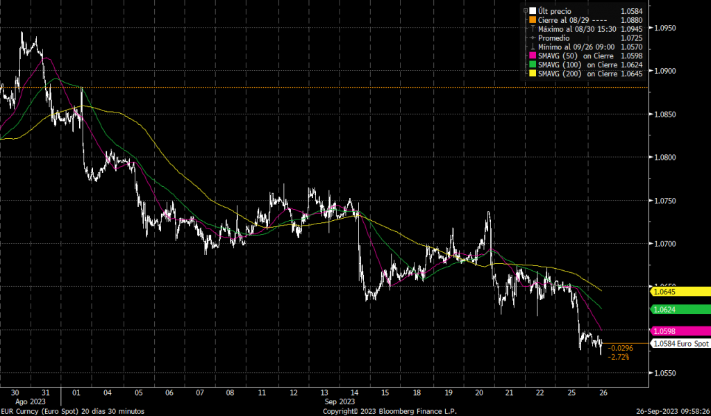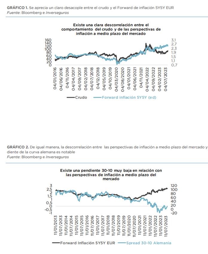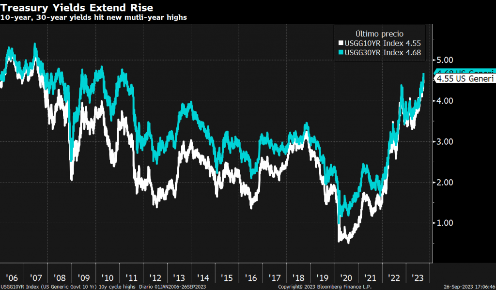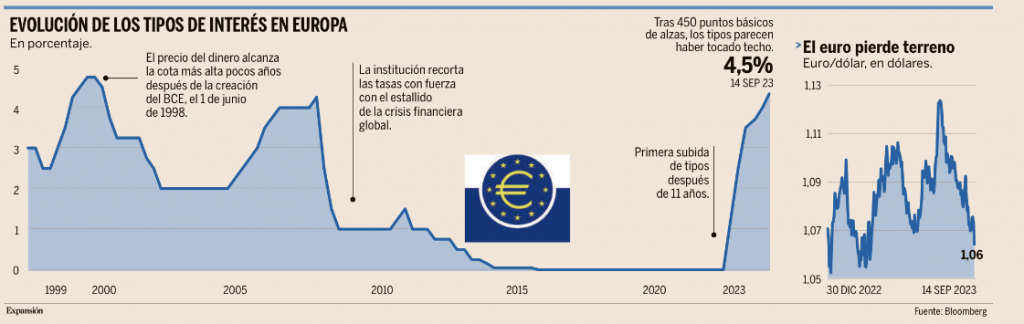 Esta semana el bono a 10 años americano ha llegado a tocar el nivel del 5,01%, su nivel más alto desde julio de 2007, extendiendo una constante reevaluación de la deuda del gobierno impulsada por datos económicos mejores de lo esperado y los vastos planes de endeudamiento que planea el gobierno de los Estados Unidos. Los bonos del Tesoro a largo plazo han aumentado sus rentabilidades desde que la Fed indicó en el denominado «punto de los puntos» de su reunión de septiembre, que los funcionarios esperaban un camino más lento hacia recortes en los tipos de interés en 2024 y 2025. El lunes varias declaraciones de inversores como Bill Ackman o Bill Gross señalaron que habían cerrado sus posiciones cortas en los bonos a más largo plazo ante la expectativa de fuerte desaceleración de la economía americana a final de año, y eso hizo que el precio de los mismos subiese y el bono a 10 años volvió a niveles del 4,80%. El movimiento tan fuerte del bono hizo que el euro ganase terreno frente al dólar, y se vaya a niveles por encima del 1,065. Bill Ackman, fundador de Pershing Square Capital Management, comentó “cubrimos nuestras posiciones cortas en bonos” “hay demasiado riesgo en el mundo para permanecer corto de bonos a los tipos actuales” “la economía se está ralentizando más rápido de lo que los datos sugieren”.
