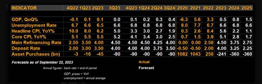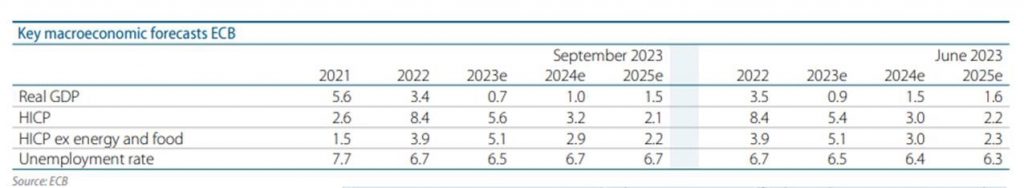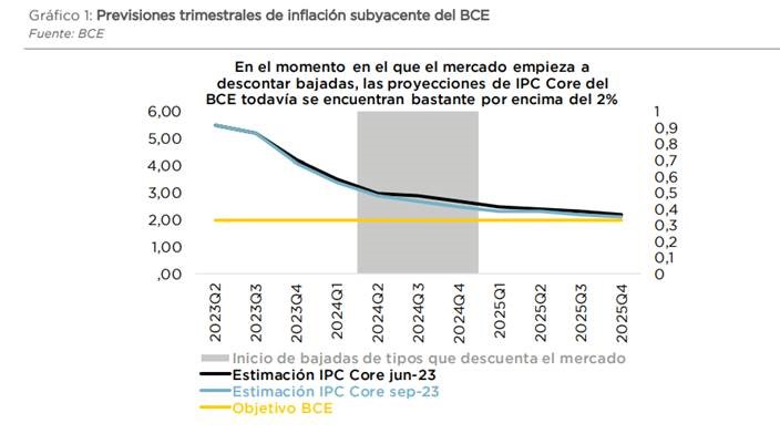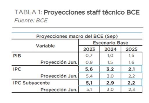 La rueda de prensa de Lagarde tuvo un sesgo totalmente continuista con el proporcionado en la reunión de septiembre, con una Presidenta que volvió a insistir en el objetivo de devolver la inflación a niveles cercanos al 2%. En materia de tipos, siguió dando a entender que es poco probable que el BCE siga subiendo en los próximos meses, centrando un poco más el acento en elementos vinculados al crecimiento. Ello no deja de tener algo de sentido, si tenemos presente que las estimaciones de PIB para el 2024 que maneja el staff técnico del Banco resultan un tanto optimistas, abriendo la puerta a ver revisiones a la baja en las cifras de la reunión de diciembre. En este sentido, Lagarde dijo que la situación económica de la Zona Euro, sigue siendo débil, con una producción manufacturera penalizada por una demanda externa a la baja y por el endurecimiento de las condiciones de financiación, que están lastrando cada vez más la inversión y el gasto de los consumidores.