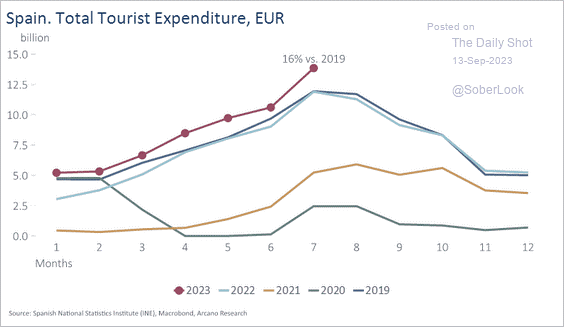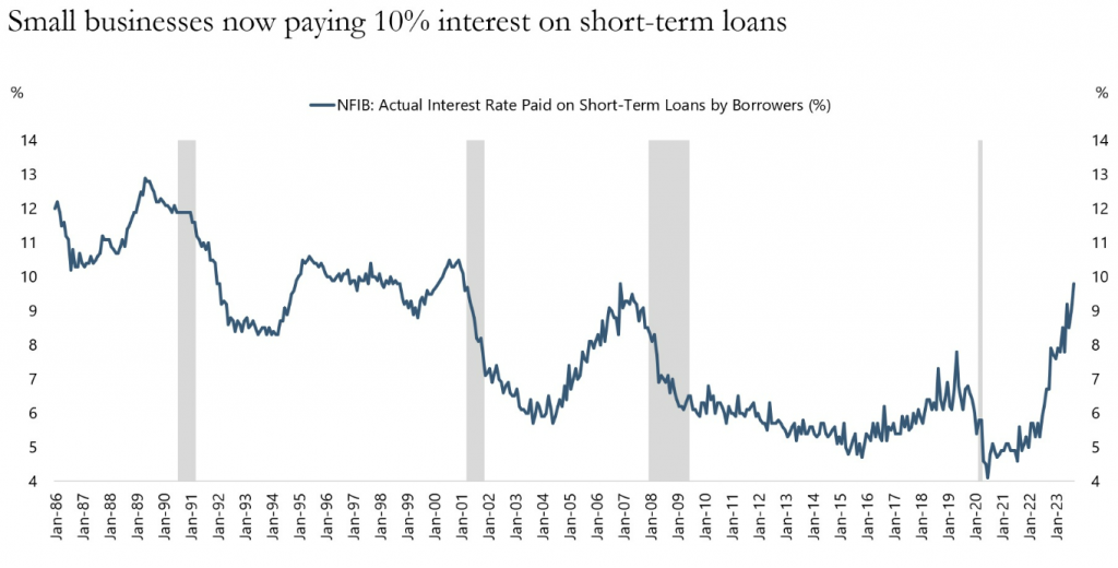 Uno de los estudios que más me han llamado la atención esta semana es un informe de Apollo en el que calcula que las pequeñas empresas en Estados Unidos ya están pagando un tipo de interés a corto plazo del 10%. Hay 33 millones de pequeños negocios en Estados Unidos, y en la encuesta mensual de NFIB (National Federation of Independent Business) se muestra que las pequeñas empresas están pagando un 10% de intereses en sus préstamos a corto plazo. https://strgnfibcom.blob.core.windows.net/nfibcom/SBET-September-2023.pdf