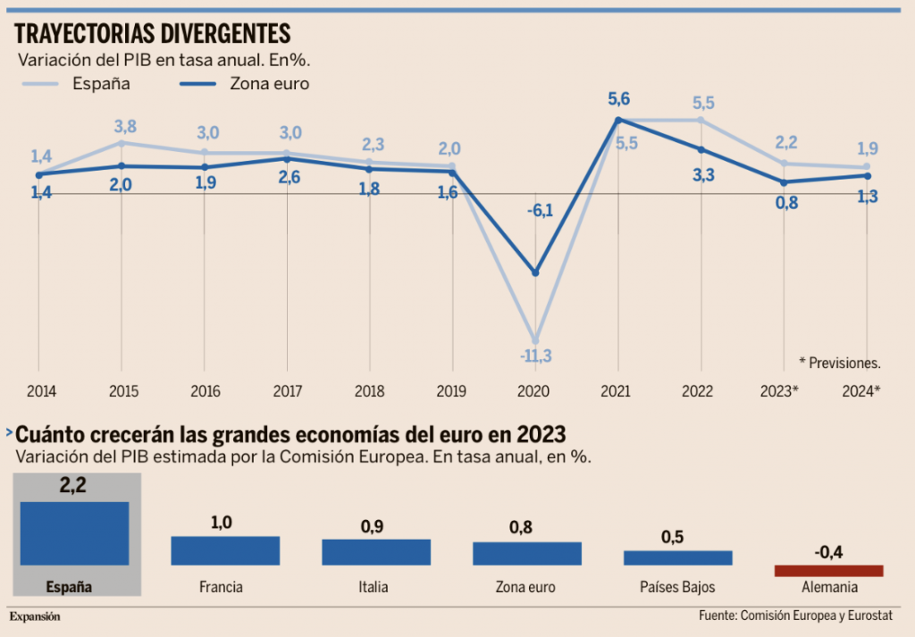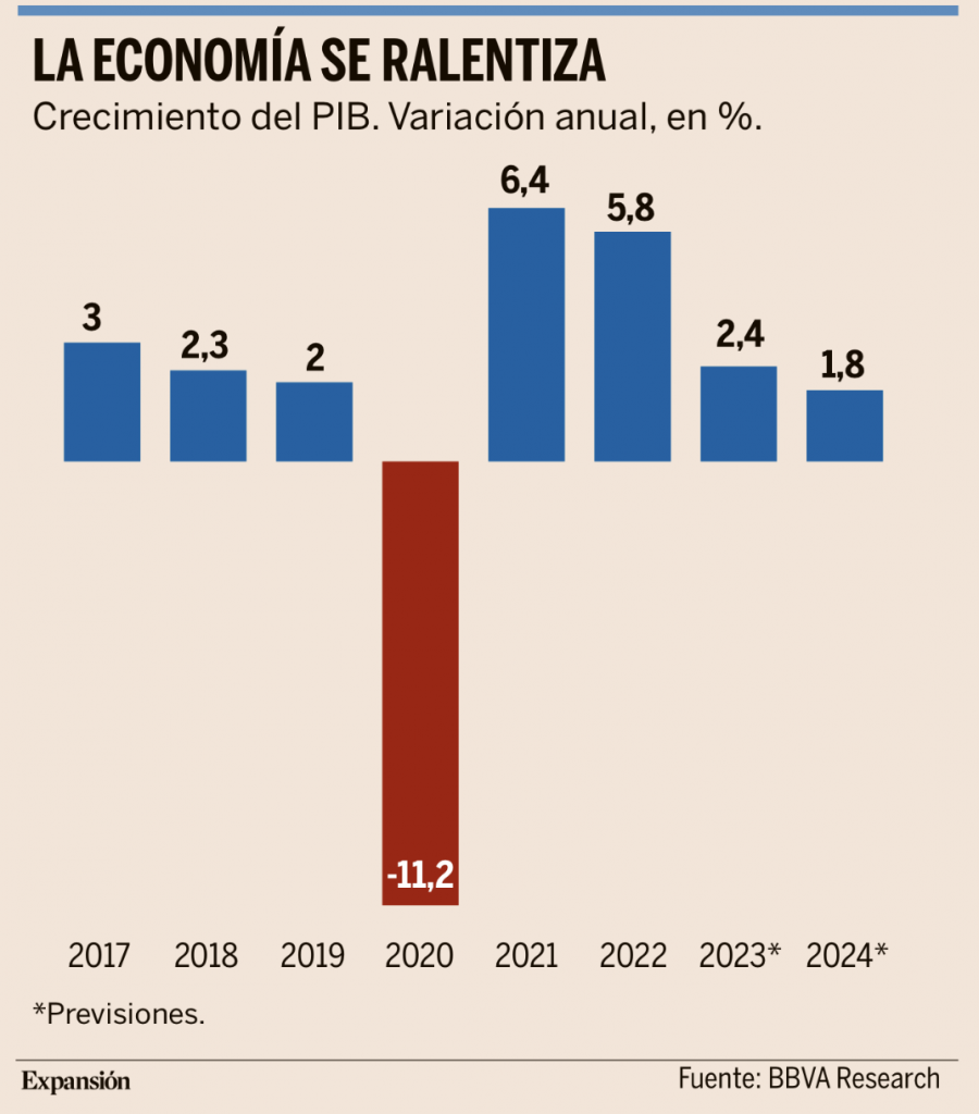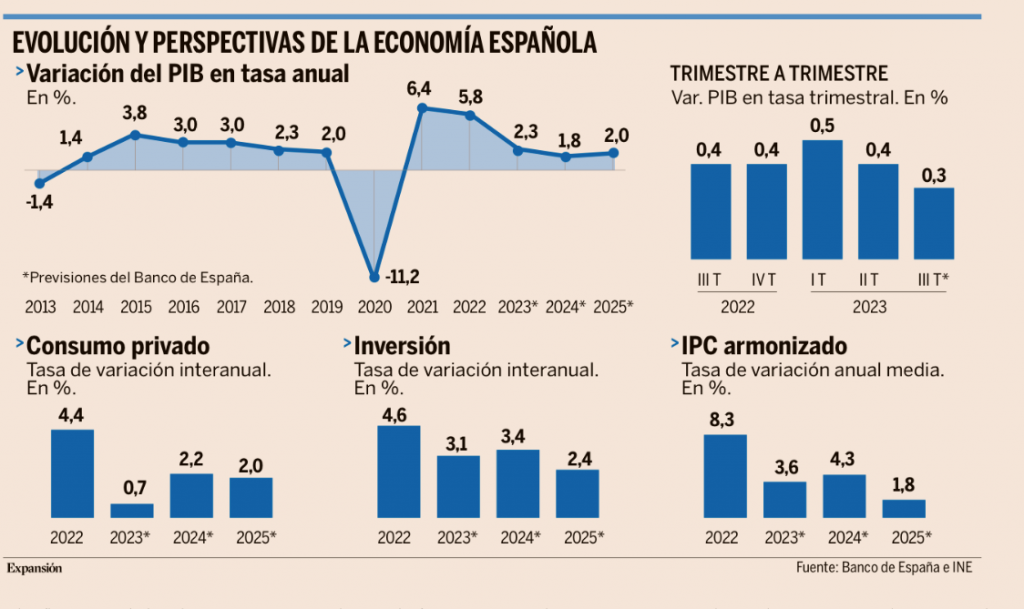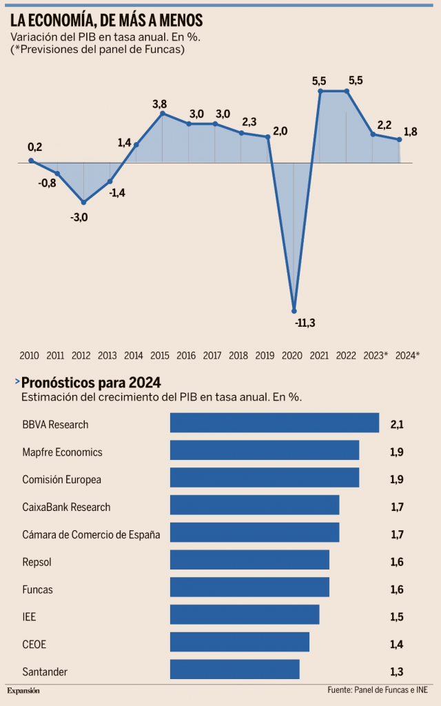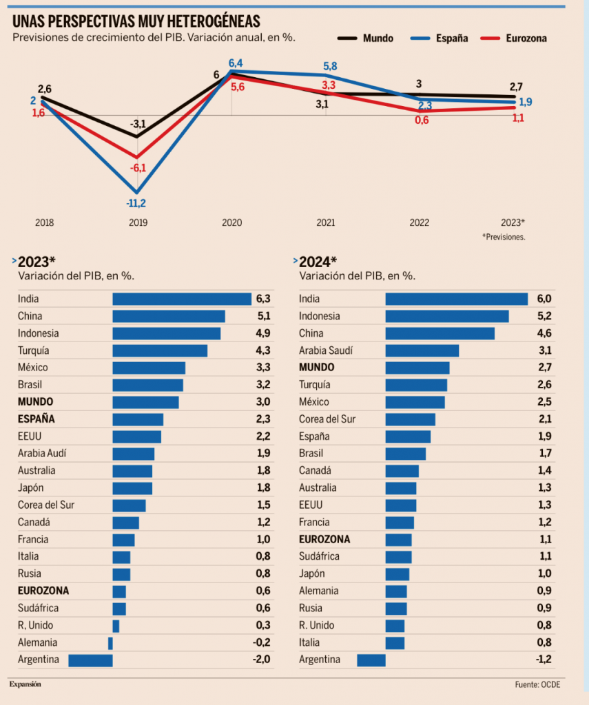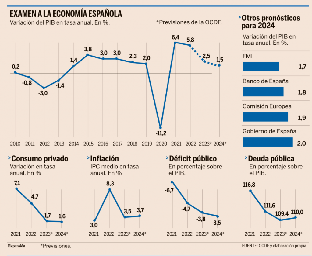 La OCDE publicó el miércoles su último Estudio Económico de España. Si hace un mes preveía un crecimiento del PIB español del 2,3% en 2023 y del 1,9% en 2024, la organización ha revisado ahora sus pronósticos para la economía nacional, ofreciendo una de cal y otra de arena. De un lado, ha ajustado 2 décimas al alza el crecimiento para este año, hasta el 2,5%, fruto en esencia del ajuste automático por la revisión positiva del INE en el PIB de 2022 (+5,8%). Sin embargo, ha recortar sus estimaciones para 2024, el PIB español crecerá un 1,5%, 4 décimas menos de lo que se esperaba en septiembre y 5 por debajo del 2% trasladado por el Gobierno a Bruselas.