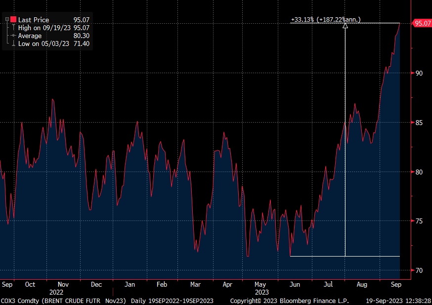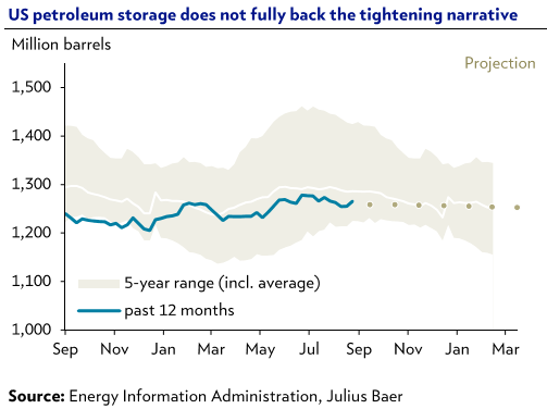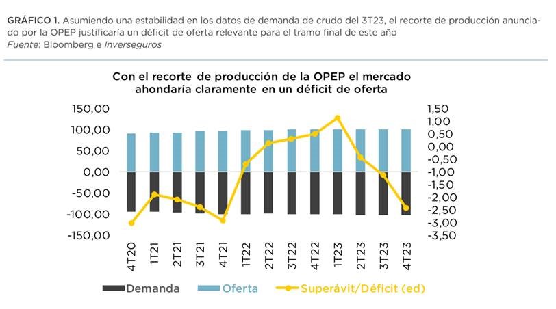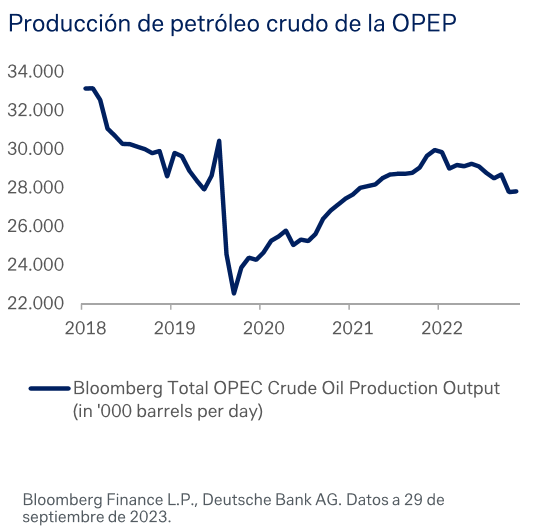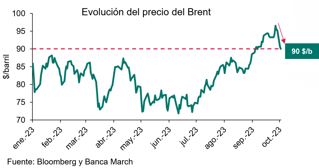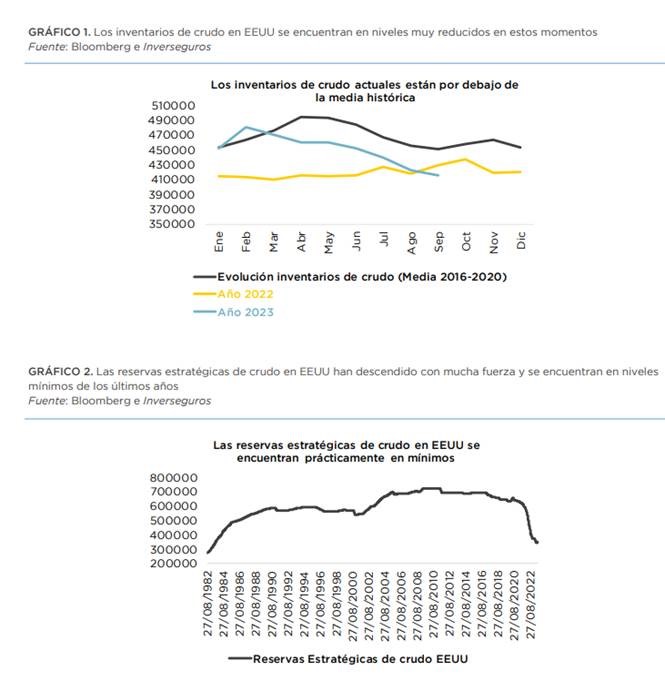 Otro posible motivo de preocupación es el mayor escrutinio y las sanciones de Estados Unidos al suministro de petróleo iraní son motivo de preocupación. En 2023, el suministro supera los 3 millones de barriles diarios (mbpd). Estas preocupaciones han impulsado los futuros del crudo al alza desde el pasado 6 de octubre. Incluso si se eliminara entre 0,5 y 1,0 millones de barriles diarios de la oferta iraní, se espera que Arabia Saudí y Emiratos Árabes Unidos, con reservas de 4 mbpd y 0,8 mbpd respectivamente, cubran el déficit, estabilizando los precios y reduciendo el riesgo de una destrucción duradera de la demanda.