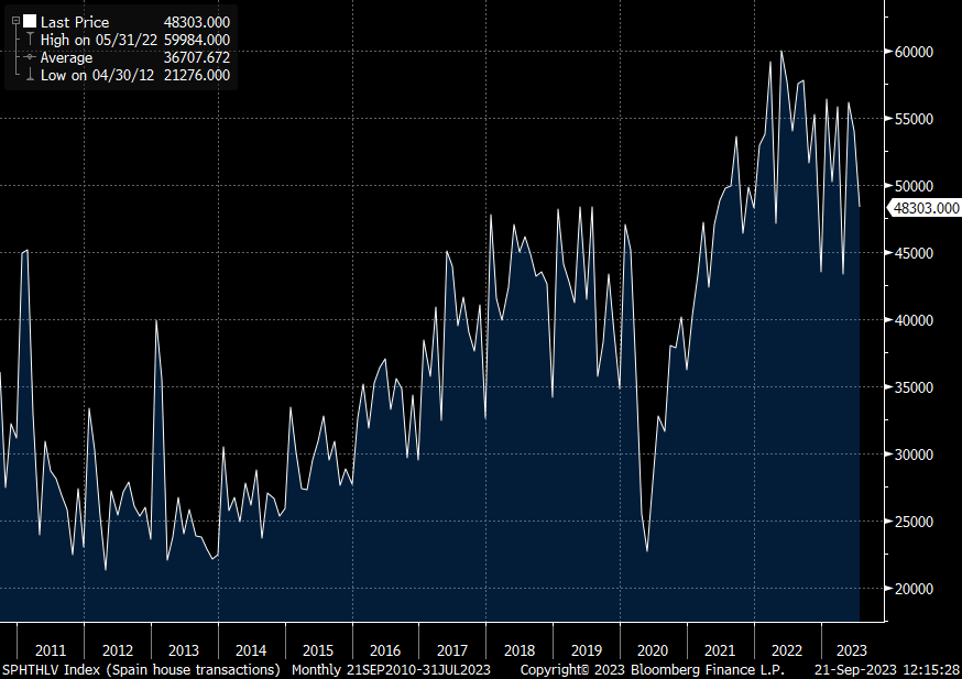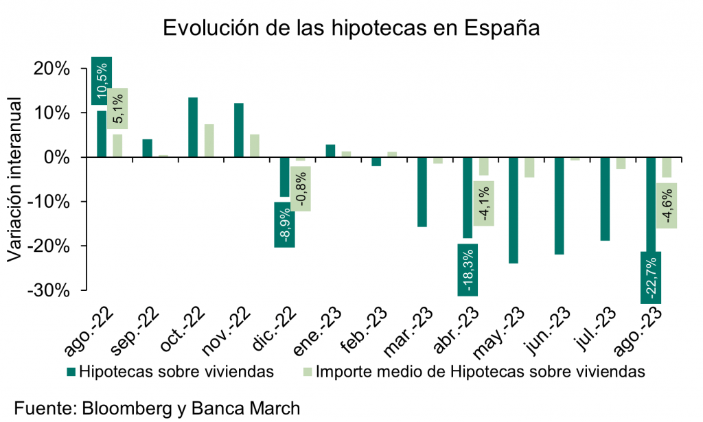 En España, las compraventas de viviendas cayeron con fuerza en agosto al retroceder un -14,4% interanual, lo que sitúa la caída en el acumulado del año en el -6,5% interanual. Por segmentos, cabe señalar que el 19,1% de las viviendas transmitidas por compraventa en agosto son nuevas y el 80,9% usadas. Las operaciones sobre viviendas nuevas cayeron un -7,3% interanual y el de usadas un -15,9%. Por otro lado, esta semana hemos conocido que el número de hipotecas constituidas sobre viviendas es de 28.344, una caída del -22,7% frente a agosto de 2022, siendo el importe medio de 138.171 euros, con una disminución del -4,6%. En cuanto a las hipotecas constituidas sobre viviendas, hay que señalar que el tipo de interés medio es del 3,25% (con una subida de 1,30 puntos respecto al del mismo mes de 2022) y el plazo medio de 24 años. Por tipología de hipotecas, el 42,1% se constituyó en agosto a tipo variable y el 57,9% a tipo fijo.