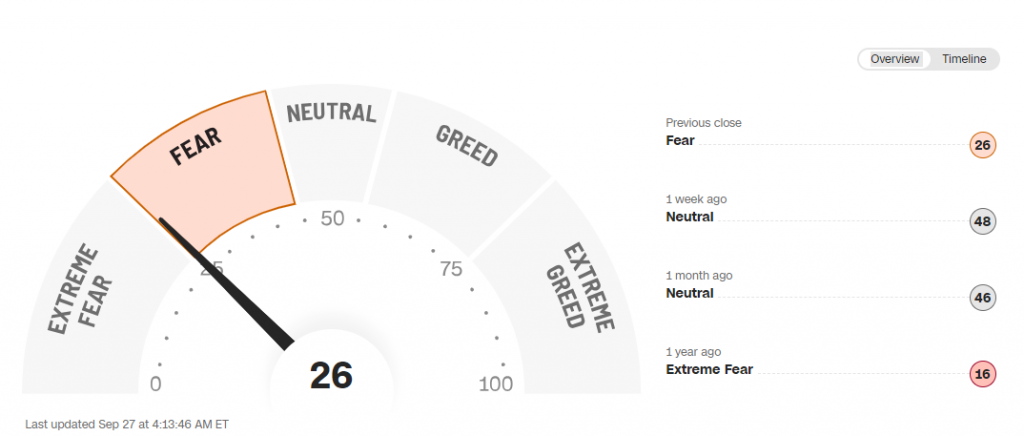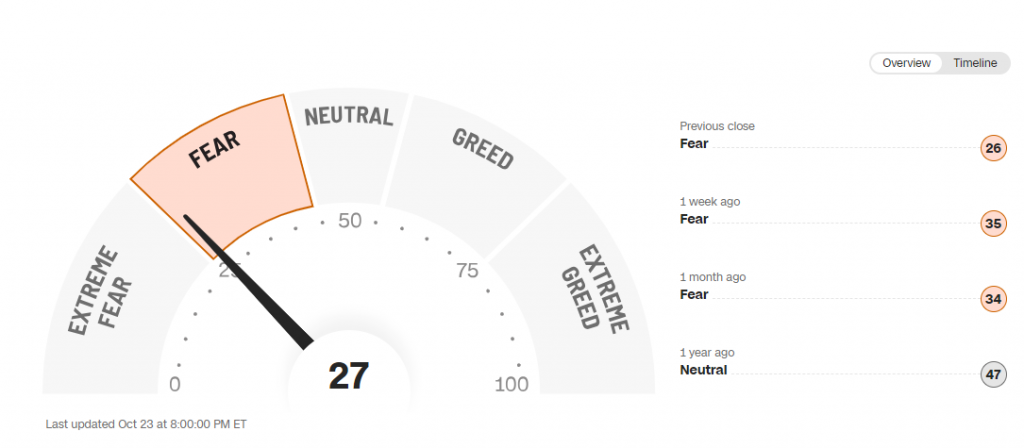 El índice miedo/codicia (Fear&Greed Index) de la CNN sigue en zona de miedo, suele interpretarse por el mercado como buen momento para comprar Bolsa esperando rebotes. https://edition.cnn.com/markets/fear-and-greed