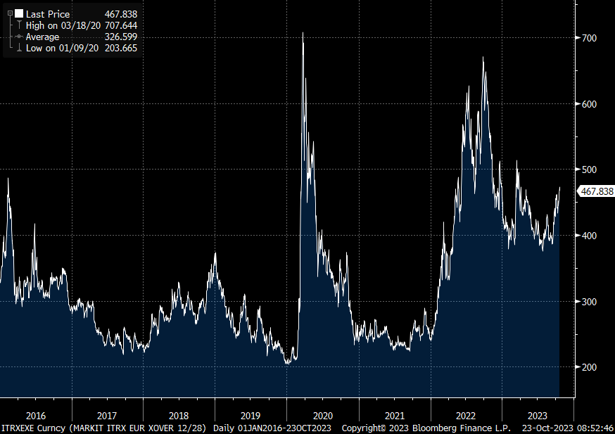 Los índices de crédito están marcando máximos relativos de todo este 2023. El Itraxx Main cotiza a 475 puntos básicos alejándose del nivel medio al que ha cotizado en todo este 2023 y que ha sido de 413 puntos básicos. Las empresas europeas con perfiles de riesgo más elevado están pagando la prima más alta en siete años lo que resalta el creciente temor de que un largo período de tipos de interés elevados y una desaceleración económica puedan desencadenar más quiebras (defaults). Esto marca la mayor brecha desde junio de 2016 y supera los niveles vistos en 2020 cuando la crisis por la pandemia del Covid-19 generó temores y quiebras caóticas. El miedo a que el conflicto en Oriente Medio se agrave, las oscilaciones materias primas tan sensibles como son el petróleo y el oro, y la evolución de la economía real en la mayoría de las zonas económicas mantiene al sector inversor en un estado de cautela permanente.