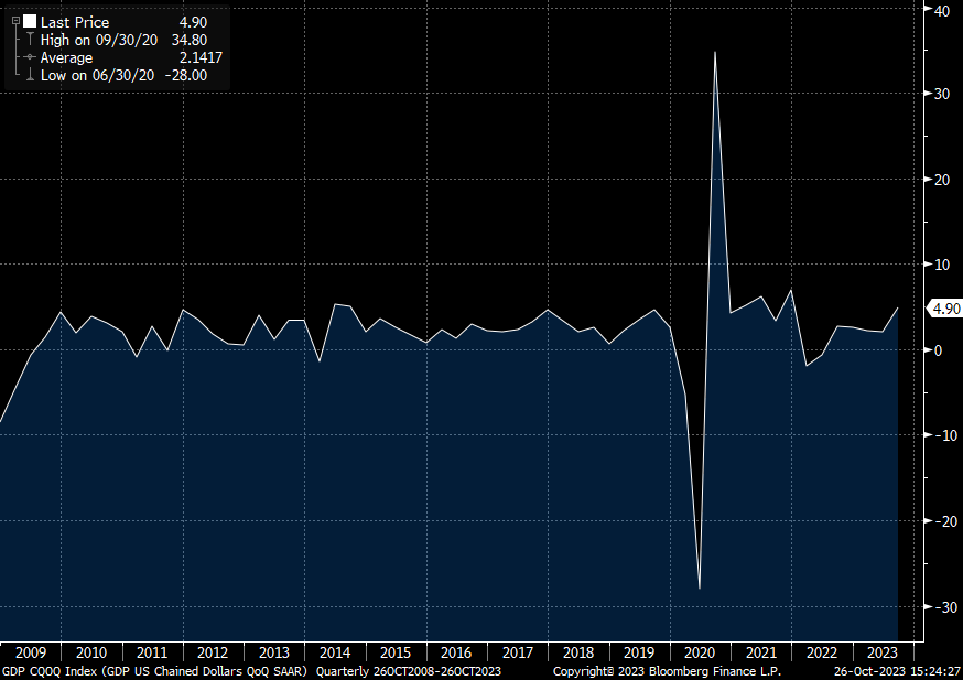 Ayer se publicó el dato de crecimiento del PIB del Tercer Trimestre del año en Estados Unidos, que, como decía al comienzo del email, subió un 4,9% por encima de lo esperado (4,5%). Es la lectura más alta desde finales del 2021. El análisis del dato reflejó una aportación desigual entre las diferentes variables que componen la referencia. El consumo privado fue el elemento que tuvo una contribución más destacada, sumando un 2,69% y el gasto público también subió un 0,79%, entre estas dos partidas supusieron un 70% de la lectura agregada. El dato de PIB supone un crecimiento muy elevado, aunque fundamentado en el consumo. Ello era de esperar después de los registros de ventas al por menor y el informe de ingresos y gastos de ese trimestre conocidos la semana pasada.