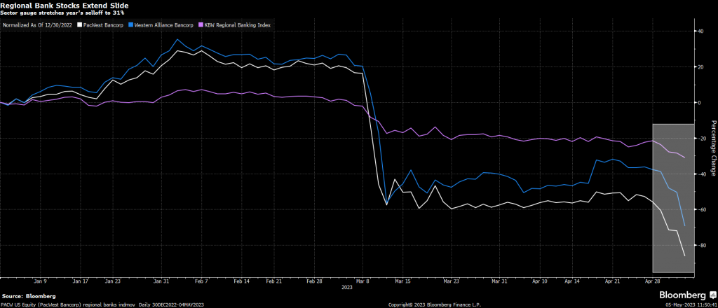 En cuanto a la crisis de los bancos regionales americanos PacWest, que ya acumula caídas en bolsa de más del 86% desde principios de año, estudia varias opciones para poder seguir adelante, como son la escisión de la entidad, el aumento de capital o una posible venta. Tras la rápida venta del First Republic a JPMorgan, Bill Isaac, Director del FDIC en la década de los 80 y que gestionó la crisis de aquella época advirtió que habrá más sufrimiento en el horizonte ya que la brusca subida de tipos ha dejado expuestos a muchos bancos regionales y pequeños tanto por el lado del pasivo como por el activo. Según la FDIC a finales de 2022 los bancos tenían un total de 620.000 millones dólares de pérdidas no realizadas en su cartera de bonos mientras que los bancos pequeños poseen cerca del 70% del crédito inmobiliario comercial donde el espacio disponible ha ido repuntando constantemente mientras se encarece el coste de financiación. Por el lado del pasivo los depósitos en el total de bancos comerciales caían un 5,0% interanual a finales de abril.