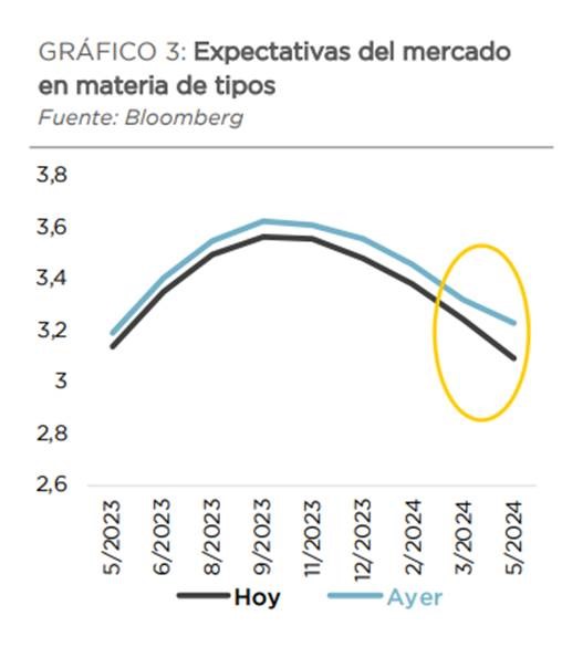 El sentimiento del mercado ha experimentado estas semanas una cierta mejora con respecto a las semanas pasadas, lo que se está traduciendo en un comportamiento favorable de los activos de riesgo y un tensionamiento de las curvas de las rentabilidades de os bonos soberanos a nivel global, estando el mismo algo más concentrado en los tramos cortos. Ello evidencia que el debate respecto al nivel de llegada de los bancos centrales y más concretamente del BCE sigue presente, lo que provoca que el mercado asigne una probabilidad algo mayor a alcanzar el 3,75%.