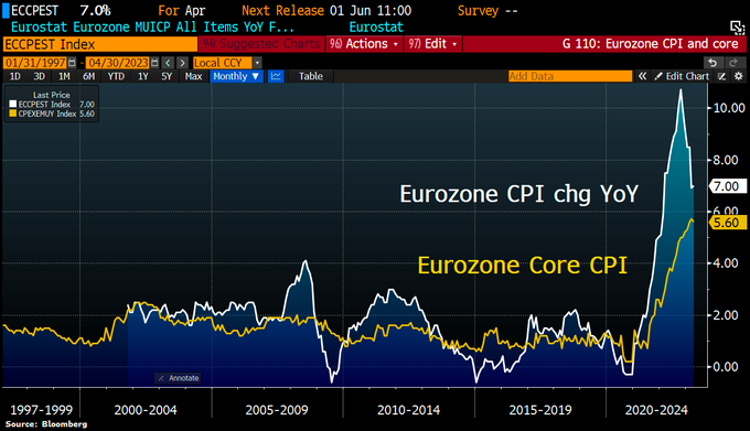 Esta mañana se ha publicado el dato preliminar de inflación de la Zona euro del mes de Junio, que se desaceleró nuevamente, pasando del 6,1% al 5,5% frente al 5,6% que se estimaba por los analistas. La referencia subyacente se aceleró en una décima hasta el 5,4% frente al 5,5% que estimaban los analistas. Estos datos reflejan que la presión de base sobre los precios se estaría rebajando, aunque de manera todavía moderada.