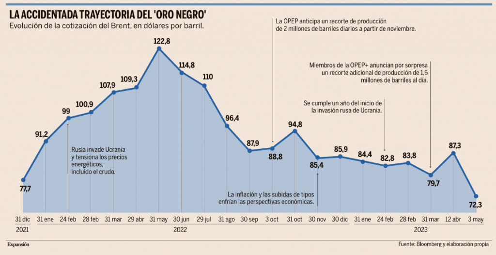 Con este telón de fondo, el precio del Brent, petróleo de referencia en Europa, acumula una caída próxima al 17% en apenas dieciséis jornadas hábiles, esto es, desde el pico alcanzado el 12 de abril en los 87,3 dólares por barril después de que la OPEP diera un golpe en la mesa a principios de ese mes y anunciara un fuerte ajuste adicional en sus niveles de producción, precisamente para propulsar su cotización. Desde entonces, su precio se ha desinflado, retrocediendo hasta el entorno de los 72 dólares por barril, que le devuelven a los niveles de mediados de marzo y le sitúan claramente por debajo de la cotización previa a la invasión de Ucrania por Rusia, cuando rondaba los 90 dólares. Todo ello tras hundirse cerca de un 9% solo en los tres primeros días de mayo, un severo correctivo que se ha producido a pesar de esos esfuerzos de la OPEP y de sus aliados, entre ellos Rusia, para impulsar el precio del crudo a golpe de tijeretazo en la producción.