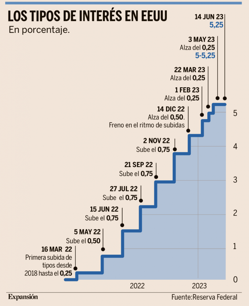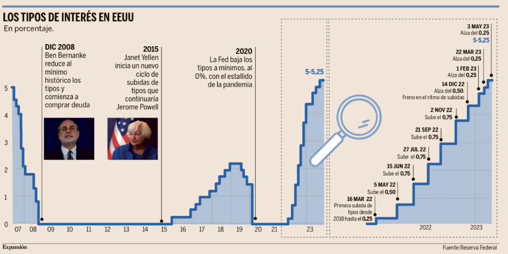La Reserva Federal de Estados Unidos subió este miércoles los tipos de interés un cuarto de punto, hasta llevarlos a un tramo comprendido entre el 5% y el 5,25%. Se trata de la décima subida consecutiva que realiza el banco central estadounidense desde que empezó a endurecer su política monetaria en marzo del año pasado. Con este último incremento, el precio del dinero en Estados Unidos se sitúa en máximos de los últimos 16 años al superar la barrera del 5%.