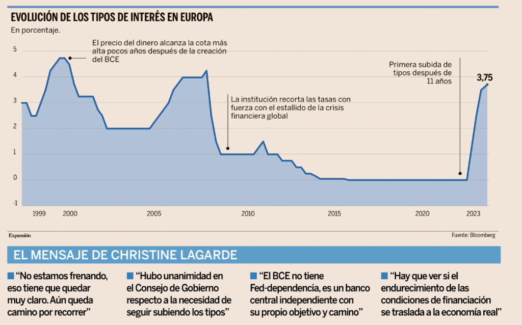Como decía a comienzo del email, esta semana en Sintra se ha celebrado una nueva edición del Foro de Bancos Centrales, organizado por el Banco Central Europeo (BCE). Tras la apertura del evento el lunes, Christine Lagarde, presidenta del BCE, dio el martes el pistoletazo de salida a la jornada con un discurso en el que alertó de que la autoridad monetaria no podrá anunciar el techo de las subidas de los tipos de interés en el corto plazo. “Es poco probable que en el corto plazo el banco central sea capaz de asegurar con confianza plena que hemos alcanzado el techo de las subidas de los tipos de interés”, recalcó Lagarde. La presidenta especificó que con su discurso no quiere adelantar futuras decisiones del organismo que, por el momento, sólo ha confirmado una subida de tipos adicional en julio. Sin embargo, la dureza del tono de Lagarde eleva las probabilidades de que estos incrementos se prolonguen después del verano. Al estilo de Australia, y presumiblemente ahora también de Estados Unidos, el BCE podría retomar las alzas de tipos tras haber parado si la inflación no responde como se espera. Para el BCE, es imperativo devolver los precios al nivel objetivo de crecimiento del 2%, una meta que Lagarde asegura que el banco central “está comprometido a alcanzar pase lo que pase”. Y ese “pase lo que pase” son tipos de interés todavía más elevados que endurecen las condiciones de financiación y golpean al crecimiento. La autoridad monetaria europea ha incrementado el precio del dinero en 400 puntos básicos desde julio del pasado año, afrontando el proceso de endurecimiento monetario más intenso de su historia. El BCE considera que existe un riesgo serio de que el crecimiento de los precios se muestre más persistente de lo anticipado. Lagarde describió cómo, en 2022, las empresas contribuyeron con dos tercios de toda la inflación, elevando los precios de sus productos y servicios para mantener, e incluso incrementar, sus márgenes pese a los shocksprovocados por la guerra y los cuellos de botella. Sin embargo, esa inflación ha mutado y ahora la amenaza son los salarios. En 2023, los trabajadores, los grandes perdedores de esta ola de inflación, presionan para recuperar poder adquisitivo. El BCE estima que las negociaciones salariales mantendrán la inflación viva en el medio plazo, con la perspectiva de que los salarios se eleven un 14% desde ahora hasta 2025. La institución considera razonable esta situación si las empresas absorben el coste adicional a costa de sus márgenes y no lo trasladan al consumidor. “Si las empresas recuperaran el 25% de la pérdida de margen que apuntan nuestras proyecciones, en 2025 la inflación se situaría claramente por encima de la prevista en el escenario de referencia, casi en el 3%”, alertó Lagarde, un escenario que obligaría al banco central a redoblar sus esfuerzos de endurecimiento monetario.