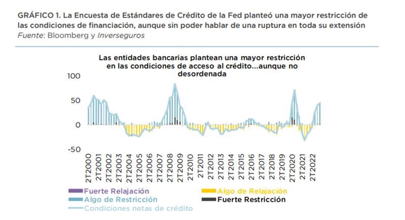 En Estados Unidos, la Encuesta de Estándares de Crédito de la Fed correspondiente al primer trimestre del año planteó un mayor endurecimiento de las condiciones vinculadas a los préstamos bancarios en la práctica totalidad de los elementos que cubre el sondeo. En realidad, los cambios no fueron especialmente agresivos, aunque si lo unimos con la dinámica que ya se arrastraba anteriormente, plantean un grado de restricción relativamente elevado en términos históricos, aunque no se puede hablar de un contexto desordenado, sin llegar a alcanzar los niveles observados en crisis anteriores y más concretamente la del 2008. Pese a ello, no deja de ser interesante que la demanda de financiación descendiese de manera bastante marcada, lo que probablemente sea un elemento que la Fed valore positivamente en estos momentos. En dicha encuesta de estándares de crédito se apreció un endurecimiento generalizado en todos los elementos vinculados al Commercial Real Estate (CRE), planteando la aplicación de spreads más elevados a los tipos de referencia y menores Loan To Value (LTV). Los bancos alegaron como razones para aplicar una mayor restricción general, las condiciones económicas menos favorables, la reducción de la tolerancia al riesgo, el deterioro del valor de los colaterales y la incertidumbre respecto al coste de financiación de las entidades, así como su posición de liquidez. La mayoría de los encuestados plantearon la perspectiva de mantener las condiciones restrictivas de cara al segundo trimestre del año.