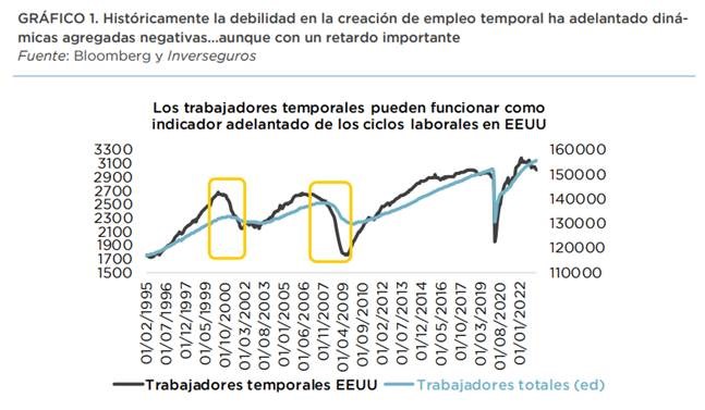 El informe de empleo estadounidense del mes de abril publicado el viernes pasado volvió a mostrar un resultado mejor de lo esperado, con sus principales referencias planteando un claro tensionamiento. De esta manera, la creación neta de puestos de trabajo se situó claramente por encima de la previsión del mercado y, desde luego, del benchmark que empezaría a justificar un incremento importante en la tasa de paro, en torno a los 70.000 empleos. De hecho, la tasa de paro volvió a descender hasta el 3,4%, en un contexto de estabilidad de la ratio de participación, lo que no supone una buena noticia a la hora de vislumbrar una dinámica a la baja de unos salarios que se aceleraron dos décimas hasta el 4,4%. Pese a todo lo comentado, lo cierto es que la creación de puestos de trabajo se está desacelerando, aunque de manera un tanto tibia. La partida de empleo temporal volvió a dar señales de debilidad, encadenando tres meses consecutivos de lecturas negativas. Esto puede llegar a ser importante, ya que se trata de un elemento que a lo largo de los últimos años ha adelantado cambios de dinámicas generales, aunque con un grado de retardo bastante relevante