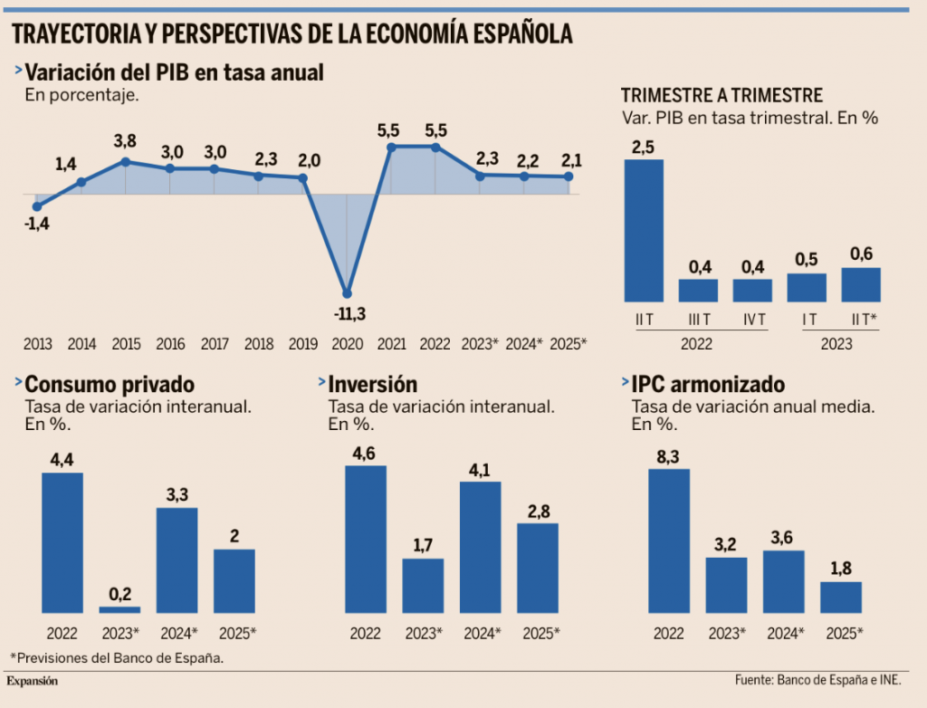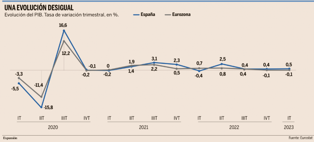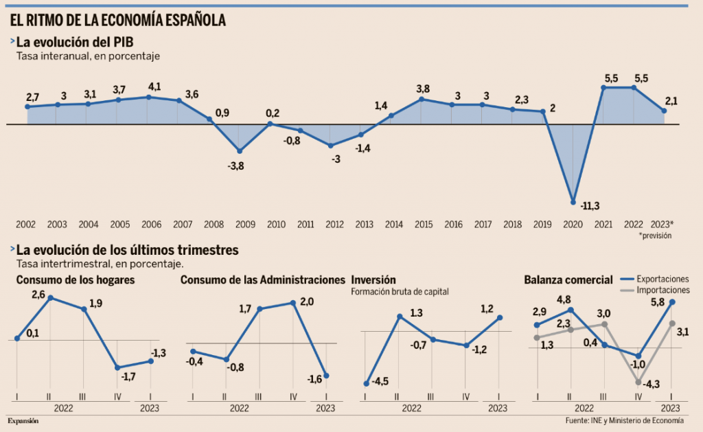 El crecimiento no deja de ser tibio, sin recuperar todavía el nivel previo a la pandemia, por mucho que el crecimiento del el primer trimestre haya sido mejor de lo esperado, pero sobre una caída del consumo muy fuerte. Ese crecimiento no tiene nada de solidez, desgraciadamente, sino que, como hemos venido diciendo durante los últimos años, se basa, en exclusiva, en el ingente gasto público movilizado.