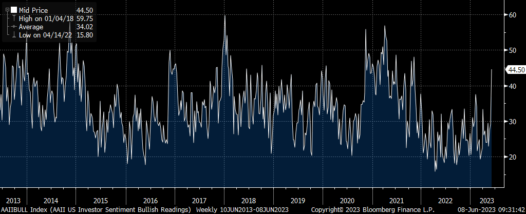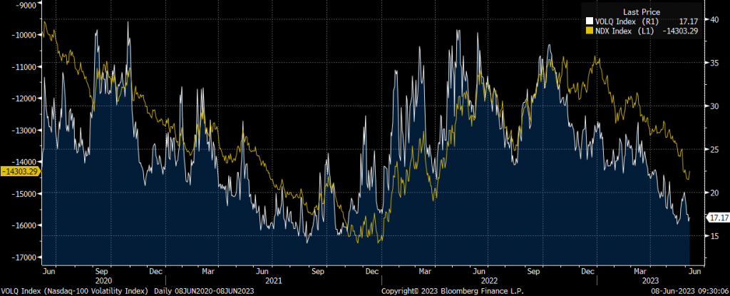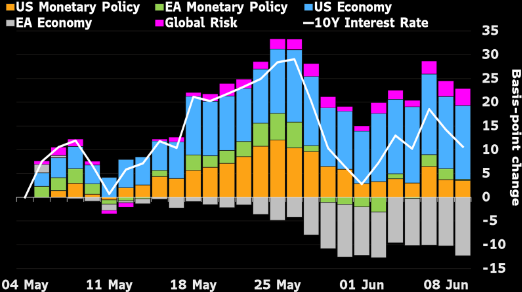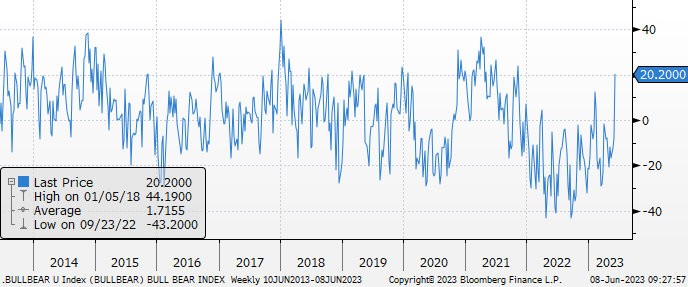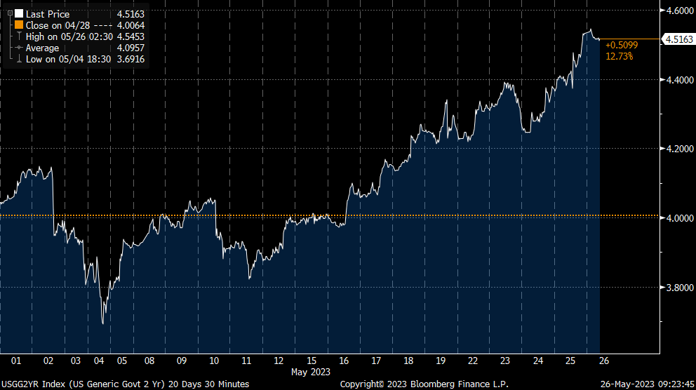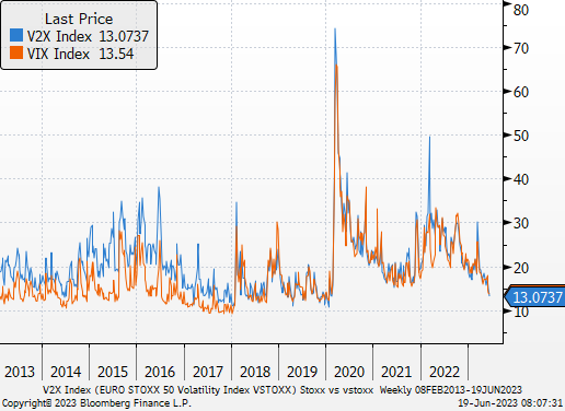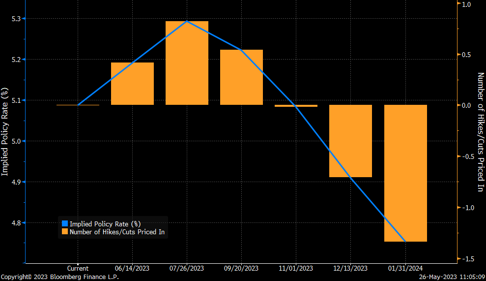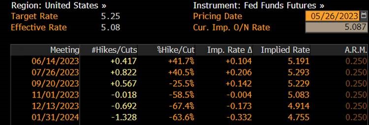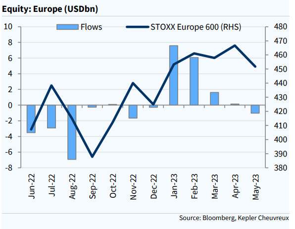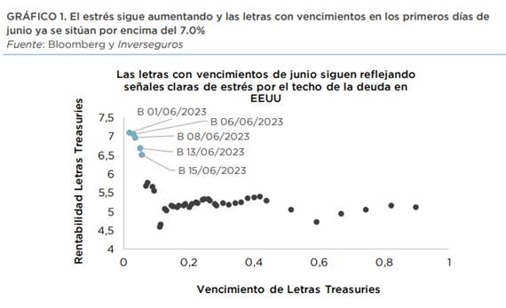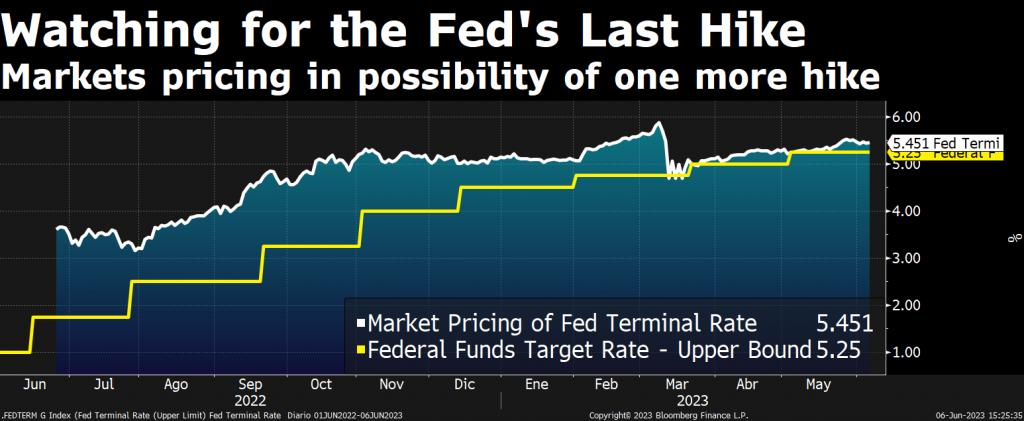 Aparte de estas preocupaciones políticas los mercados miran con preocupación a la Fed pues muchos analistas creen que de tanto estirar la política monetaria actual van a acabar metiendo a la economía americana en recesión. El mercado pone en precio aproximadamente un 75% de probabilidad de que la Fed suba tipos en julio después de la pausa de junio. En el BCE el mercado pone casi una probabilidad del 100% de subida de 25 puntos básicos en julio y algo de probabilidad de que haya otra en septiembre.