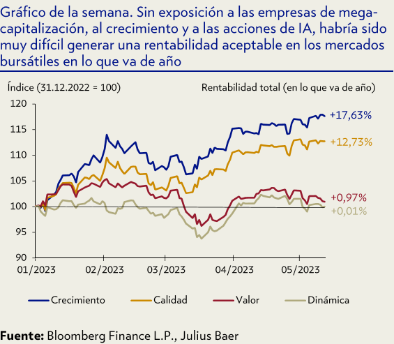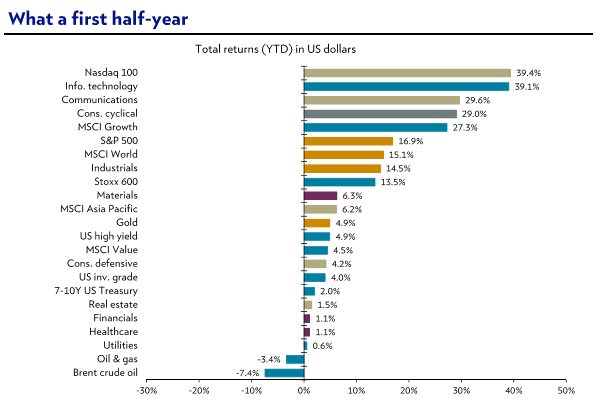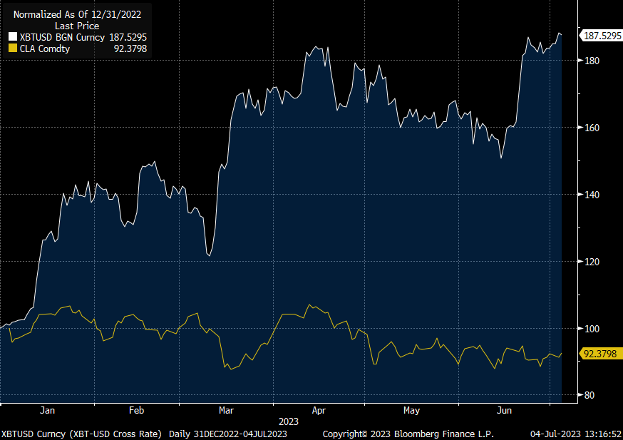 En esta primera mitad del año hemos visto como la diferencia entre lo que más ha subido, el Bitcoin (+87%), y lo que más ha bajado, el petróleo (-12%), se sitúa en el 90%. Es un buen ejemplo de cómo, por el momento, el 2023 ha servido para poner en perspectiva 2022, con muchos de los activos que más sufrieron recuperando una parte de las pérdidas y viceversa.