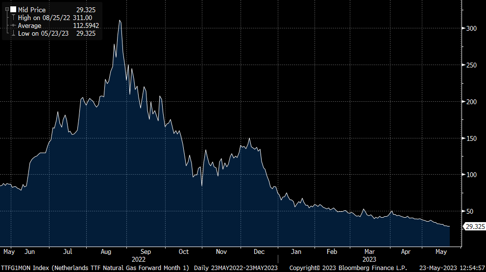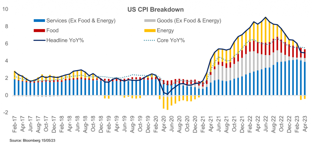 En Estados Unidos se publicó el miércoles el dato de IPC de Abril, que se aceleró en tres décimas respecto al mes anterior, experimentando un crecimiento del 0,4%. EL IPC subyacente se mantuvo sin cambios respecto al mes anterior (+0,40%). En términos interanuales, la referencia general siguió confirmando el proceso de desaceleración que se está viendo en los últimos meses hasta el 4,90%, ligeramente por debajo del 5% que esperaba el consenso de analistas del mercado. La inflación subyacente también se desaceleró en una décima hasta el 5,5%. Este IPC publicado sigue confirmando el proceso de desaceleración de precios, si bien es cierto que las presiones inflacionistas de base se mantienen elevadas, lo que seguiría apoyando el proceso de subida adicional de tipos por parte de la Fed.