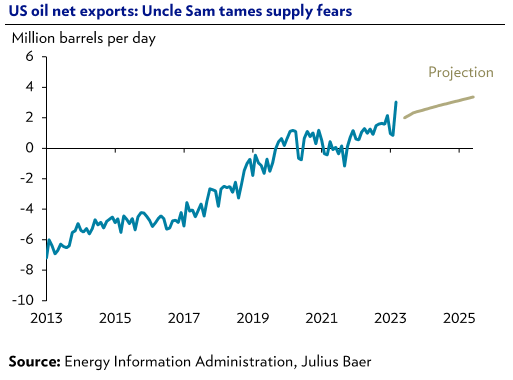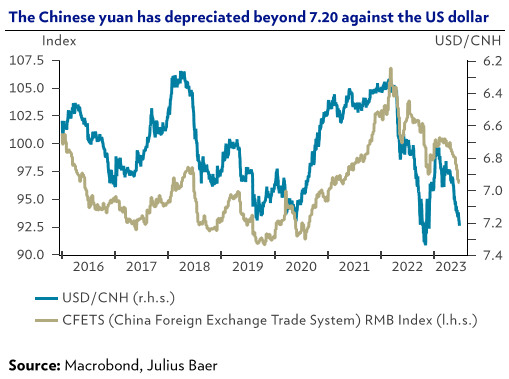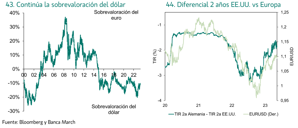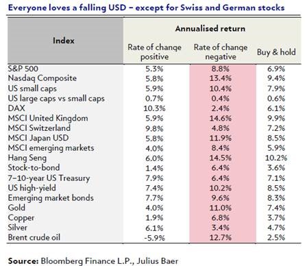 Desde un punto de vista del análisis técnico, según Julius Bäer, el US Dollar Index (dólar medido contra una cesta de las principales divisas) ha dibujado una figura de hombro-cabeza-hombro y es probable que vuelva a mínimos de 2021 (10% de caída adicional). Un dólar depreciándose es positivo para todas las clases de activo, menor para renta variable alemana y suiza.