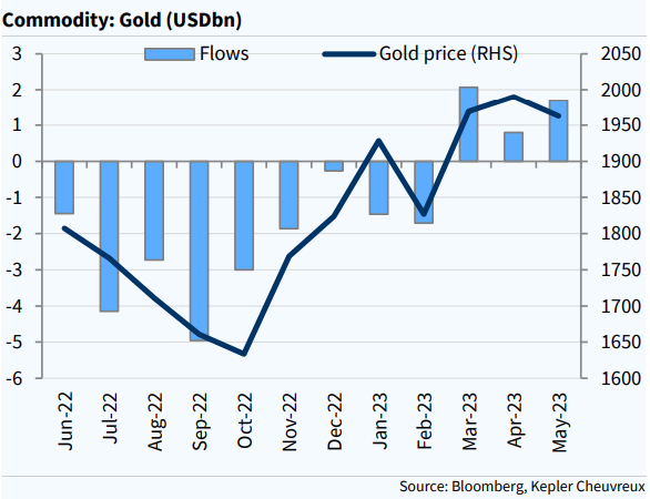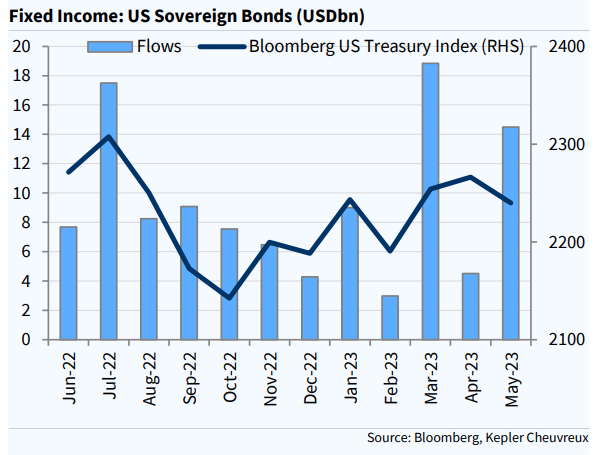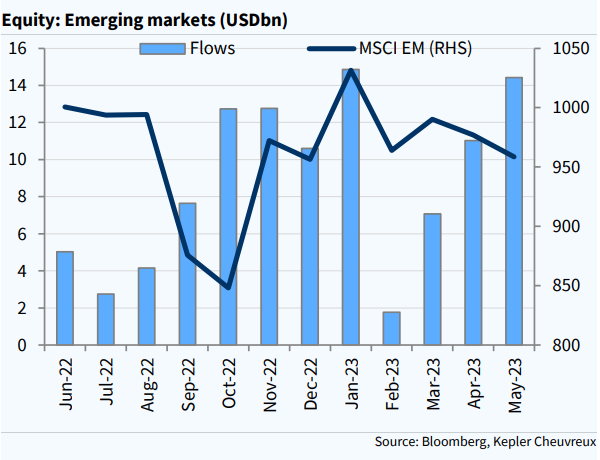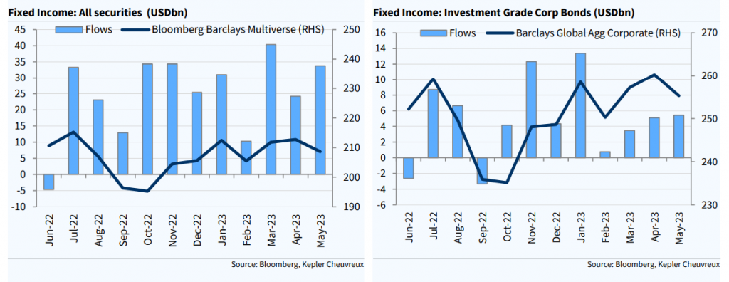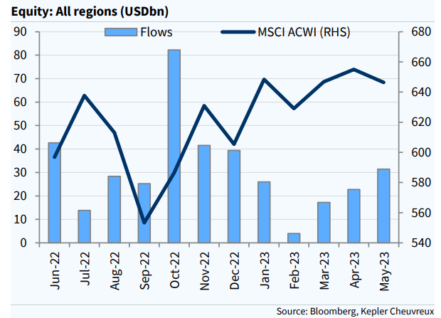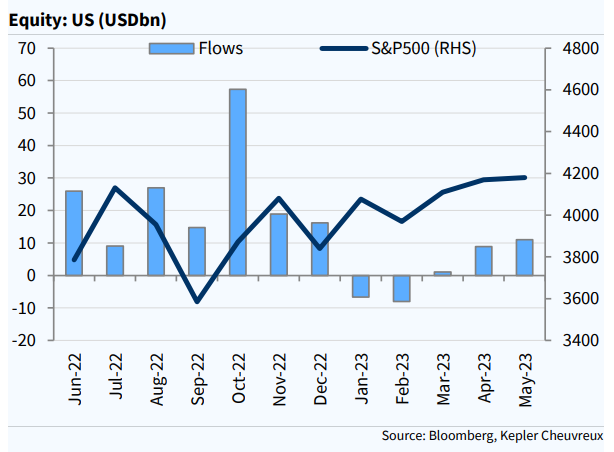 En el último informe semanal de flujos de entrada y salida en Fondos de Kepler Chevreux se ve cómo se están acelerando los compras (inflows) de Fondos de Renta Variable, es el mayor “inflow” semanal del año en ETFs gracias a las entradas en Renta variable. Los 39,5 billones de dólares que entraron en todos los ETFs son el noveno mayor “inflow” semanal desde que Kepler recopila los datos.