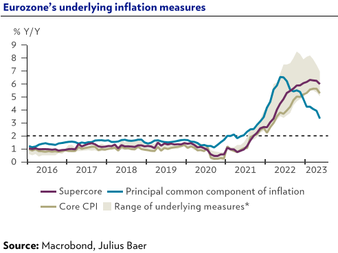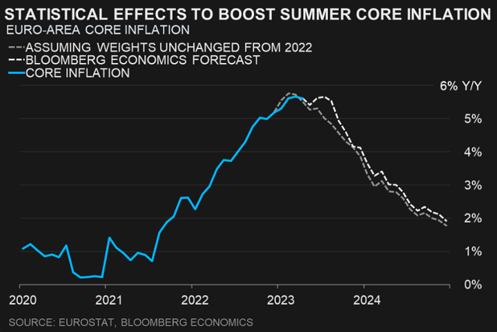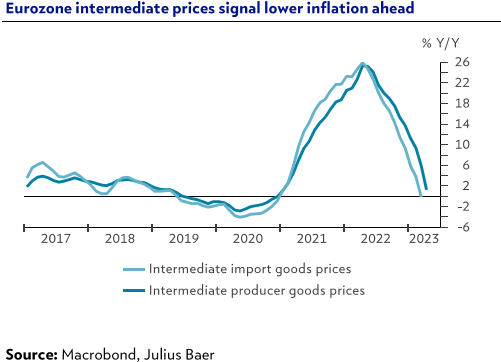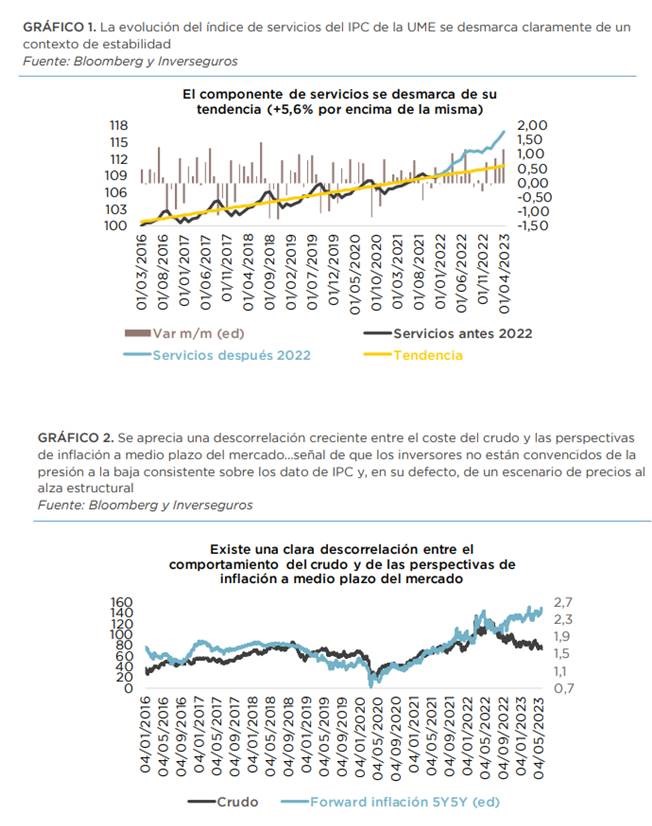 Esta semana se ha confirmado la moderación de la inflación en la zona euro. El dato final del IPC de junio ratifica el freno de la inflación hasta un avance del +5,5% interanual desde el +6,1% anterior. Por componentes, la caída de los precios de la energía es el principal factor que explica esta moderación, al registrarse una caída del -5,6% interanual de los precios de la energía lo que retiró seis décimas a la inflación. Asimismo, también los precios de los alimentos se moderan al aumentar un +11,6% interanual frente al +12,6% anterior. En el lado de la inflación subyacente las noticias fueron menos alentadoras y la tasa repuntó dos décimas en junio hasta un crecimiento del +5,5% interanual y situándose así en los mismos niveles que la tasa general. Este repunte, estuvo en gran medida explicado por el efecto base de la entrada en vigor el año pasado de ayudas al transporte público en Alemania (el billete de transporte público por 9 euros al mes que estuvo en vigor de junio a septiembre del año pasado). Solamente este efecto habría empujado dos décimas al alza los precios de los servicios, que en el conjunto de la zona euro avanzan a ritmos del +5,4% interanual y contribuyendo con 2,2% a la inflación general (un 40% de la inflación se explica por los servicios). Finalmente, por el lado de los precios de los bienes, en junio continuó la moderación y el aumento de los precios se sitúa en +5,5% interanual.