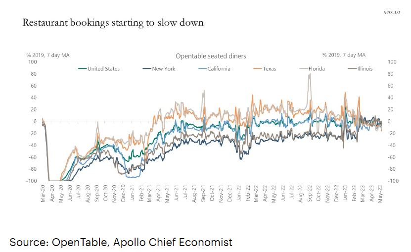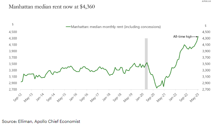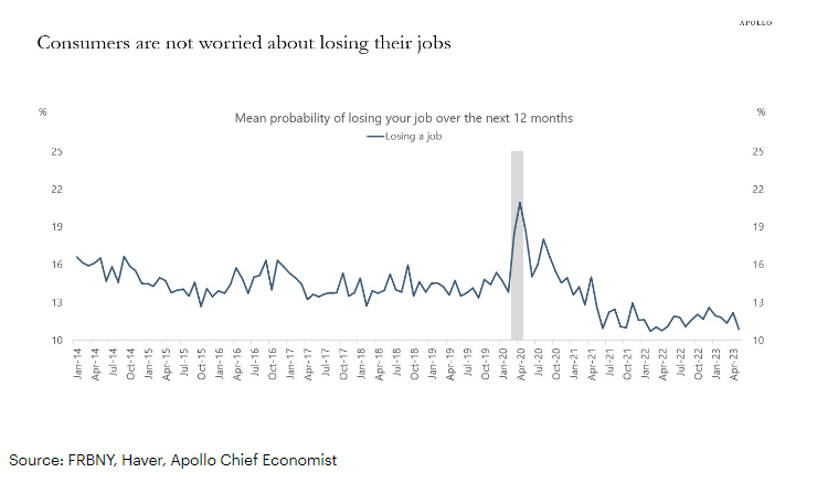 Otros dos los gráficos que más me han llamado la atención esta semana, y que son síntoma de cómo se encuentra la economía americana, y sobre todo su inflación, son dos gráfico de Apollo, en uno se ve cómo los alquileres en Manhattan han alcanzado máximos alcanzando el alquiler medio mensual los 4.360 dólares. La vivienda representa un peso del 40% en la cesta de la inflación, lo que la inflación de rentas del alquiler un problema para la Fed de cara a relajar su política de subida de tipos. En el otro se representa el poco miedo que tiene el consumidor americano a perder su trabajo (con una tasa de paro en el 3,4%), también una señal de presión a los niveles de inflación.