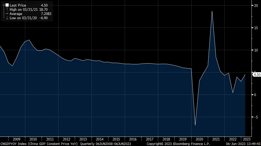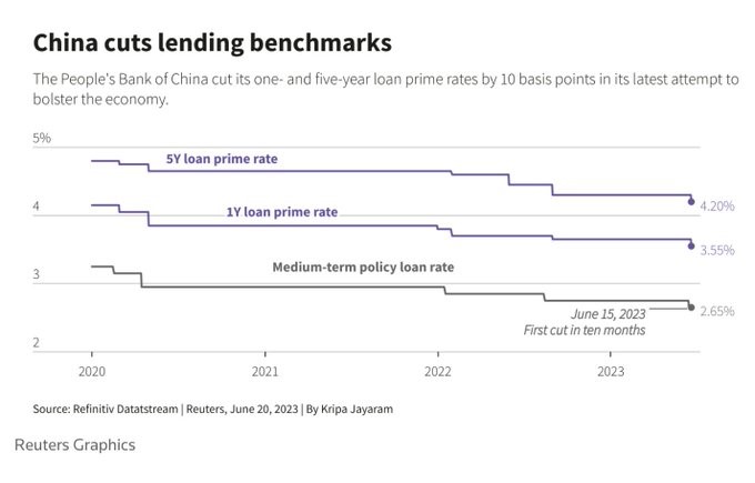 Según el China Securities Journal, China podría implementar políticas fiscales adicionales con el fin de apoyar la recuperación económica después de los recortes de tipos realizados. Además la agencia de calificación crediticia S&P recortó el fin de semana pasado sus estimaciones de crecimiento para China desde el 5,5% al 5,2% este año. Una encuesta de Bloomberg prevé un crecimiento del PIB de China del 5,5% en 2023, del 4,9% en 2024 y del 4,6% en 2025.