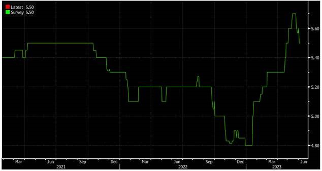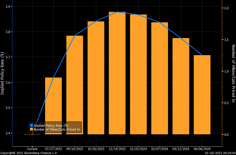 Según una encuesta de Bloomberg, los economistas esperan que el BCE realice dos subidas adicionales hasta alcanzar el 4.0% en septiembre, lo que supone una acción adicional respecto a la encuesta anterior. El primer recorte de tipos se espera en el 2T de 2024.