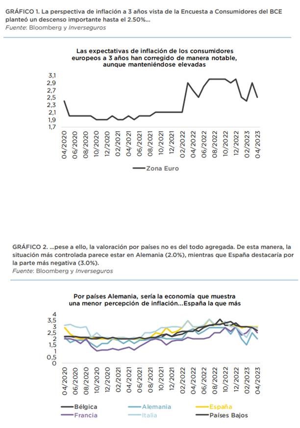 Veremos cómo se desarrolla este verano del 2023, pero promete que habrá volatilidad. El sector servicios que era el que estaba siendo el motor de la economía a nivel global está perdiendo fuelle. En China el PMI de servicios frena a 53,9 en Junio frente al 57,1 anterior, mientras que en la eurozona lo hace a 52 frente a los y 55,1 puntos del mes anterior y en España el PMI de servicios cayó en Junio a 53,4 desde los 56,7 de Mayo. La razón de la pérdida de dinamismo del sector es la menor demanda, que permite poner al día las carteras de pedidos. La lectura conjunta del sector industrial y de servicios apunta a un estancamiento de la eurozona en el comienzo del tercer trimestre de este año. No obstante, también frena la intención de subir precios de las empresas. Si en el sector servicios cae a su menor nivel en 21 meses, en el sector manufacturero, los precios industriales de mayo muestran un retroceso del -1,5% interanual, a pesar incluso de que, tras las muy negativas cifras de producción industrial de abril, las de mayo muestran una ligera recuperación (España +0,6%, Francia +1,2%). Por otro lado, el BCE publicó su encuesta de expectativas de inflación del consumidor. Disminuyen, pero se mantiene por encima del objetivo de inflación del BCE. A 12 meses se sitúan en el 3,9% y a 3 años en el 2,5%.