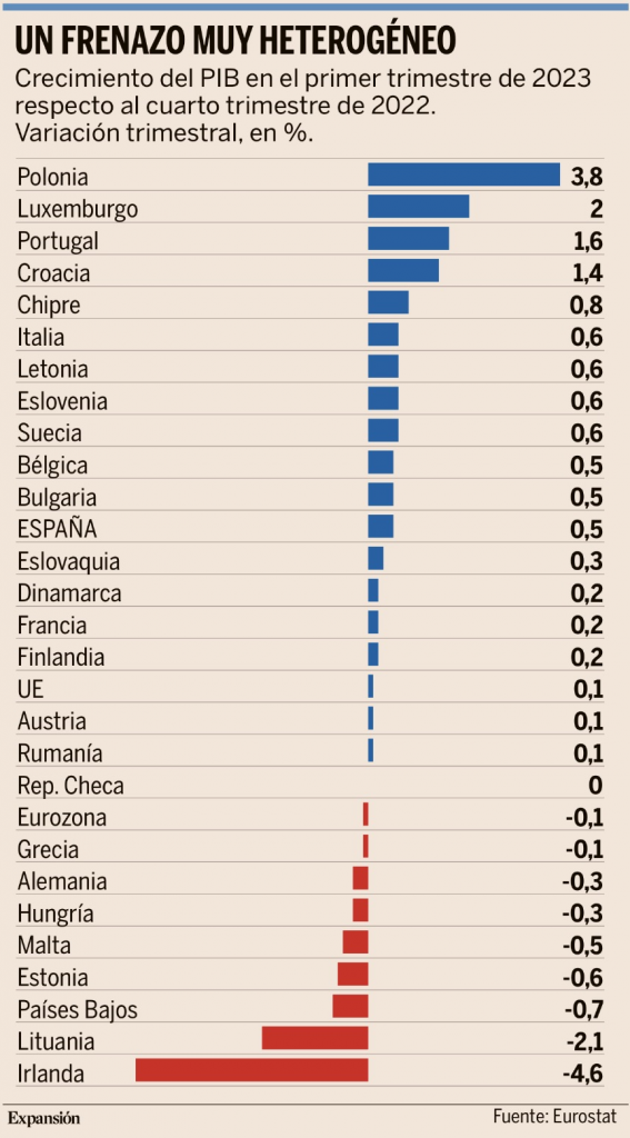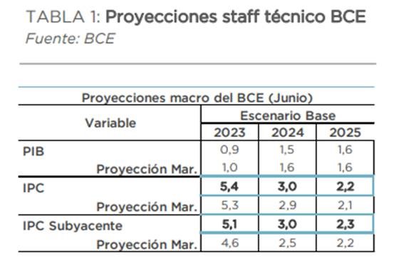 En cuanto al crecimiento para 2023, la encuesta sube la previsión de la zona euro y la eleva al 0,6%, desde la previsión del 0,2% realizada en el primer trimestre, pero sigue por debajo de la previsión del servicio de estudios del BCE (1%). Para 2024 y 2025, la encuesta estima un crecimiento del 1,2% y 1,6%, respectivamente, inferiores a los estimados en el primer trimestre y por debajo de lo estimado por el servicio de estudios del BCE.