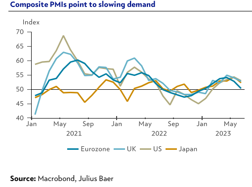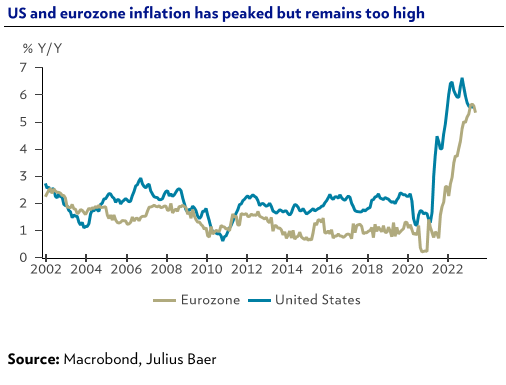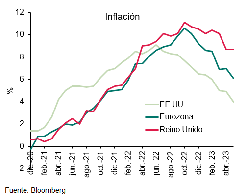 La inflación está moderándose en Estados Unidos (4%), Europa (5,5%) y Suiza (1,7%), mientras que en Reino Unido se mantiene más elevada (8,7%). Con todo, los Bancos Centrales insisten en que no han terminado con las subidas y es de esperar que veamos una subida del 0,25% adicional, tanto en Europa, como en Estados Unidos.