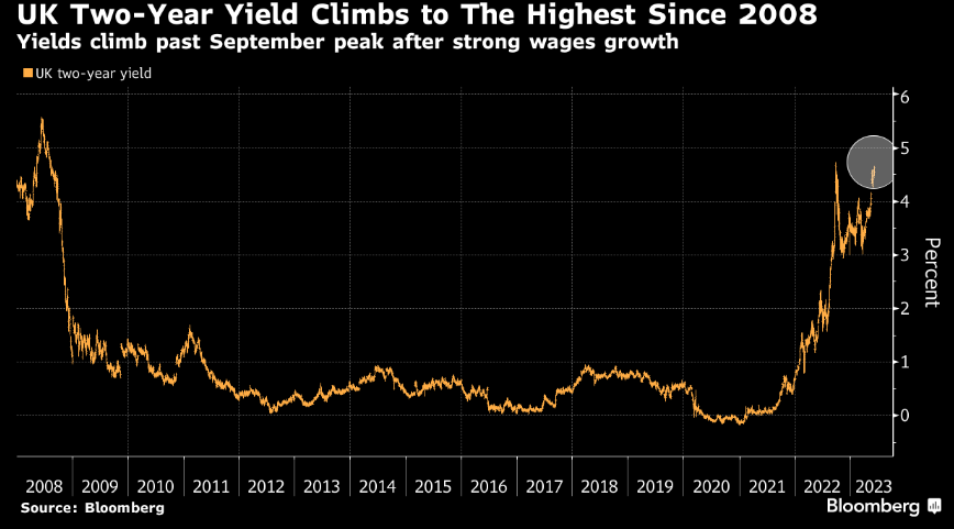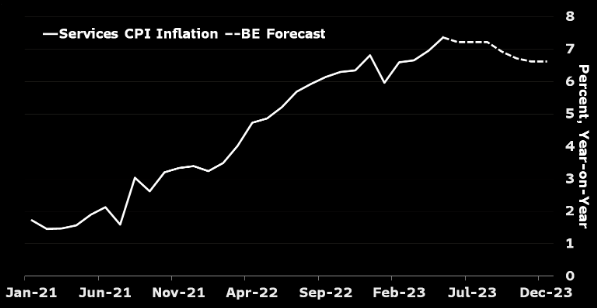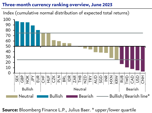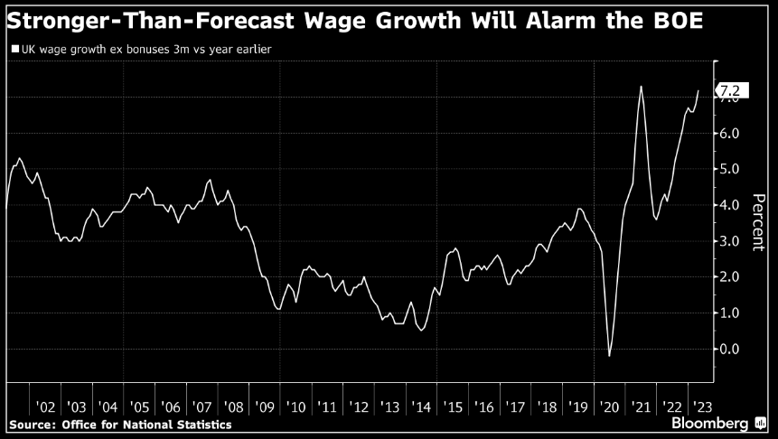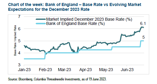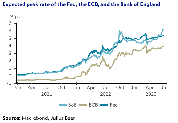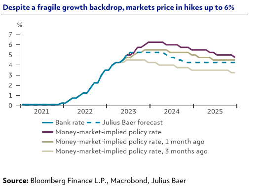 El Banco de Inglaterra ha tenido que subir tipos más de lo esperado, 0,5%, dada la sorpresa negativa de inflación (+7,1%) y el aumento salarial (+7,2%). Los analistas esperan una subida más de 0,25% en julio, hasta el 5,25%, pero las subidas hasta el 6% que espera el mercado a los analistas de Julius Bäer les parecen excesivas dado el flojo crecimiento, visión que comparto.