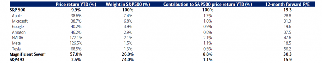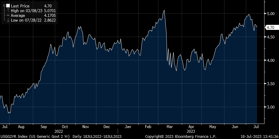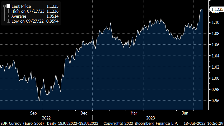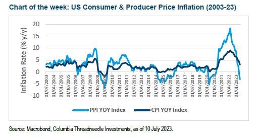 El IPC general de Estados Unidos (que incluye la energía) se situó en el 3% interanual en junio, un 1% por debajo del 4% del mes anterior. El descenso de los precios de la energía, que cayeron un -1,2%, fue la causa de la caída de la inflación. En cambio, la inflación de los servicios, aunque todavía elevada (3,5%), siguió bajando. La inflación subyacente (que excluye la energía y los alimentos) se situó en el 4,8% interanual, por debajo de las expectativas del mercado del 5% y del 5,3% del mes anterior. Los datos de inflación provocaron un brusco cambio en los niveles de rendimiento de los bonos del Tesoro estadounidense. En el vencimiento a 2 años, la rentabilidad cayó 9 puntos básicos, mientras que, en el vencimiento a 10 años, cayó 16 puntos básicos durante la semana. El renovado sentimiento alcista hacia los bonos mundiales se tradujo en su mejor semana desde noviembre de 2022, el Bloomberg Global Aggregate Index subió un 2,3% la semana pasada.