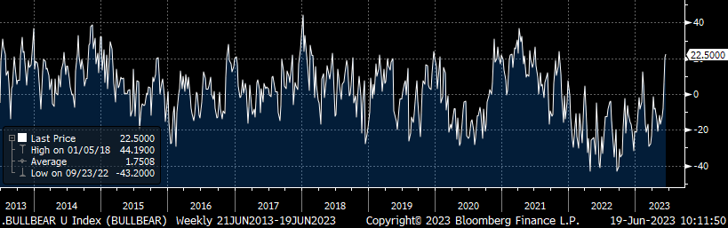 Lo más importante de la semana ha sido el discurso mantenido por los principales banqueros centrales en Sintra, que no planteó sorpresas. Así, el presidente de la Fed, Powell, la presidenta del BCE, Lagarde y el gobernador del Banco de Inglaterra (BoE), Bailey, subrayaron que la inflación está resultando ser más persistente de lo que se esperaba, y que todavía queda camino por recorrer en materia de tipos. En este sentido, Powell dijo que la política monetaria puede no ser lo suficientemente restrictiva, Lagarde sugirió que un aumento de tipos por parte del BCE en julio era una certeza, mientras Bailey prometió hacer lo necesario para que la inflación volviera al 2% indicando que los tipos podrían ser más altos por más tiempo de lo que los mercados esperan actualmente. El presidente del Banco Central de Japón, Ueda, fue el caso atípico, diciendo que la inflación en Japón aún no requería aumentos de tipos. Según el Financial Times esta mañana, la persistente inflación del Reino Unido y las críticas al Banco de Inglaterra por su incapacidad de reducir los niveles de precios han convencido a los miembros del BCE para mantener una postura hawkish en relación a las subidas de tipos con el fin de evitar ser acusados de no hacer lo suficiente para contener las presiones inflacionistas.