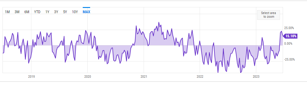 Las Bolsas siguen premiando las buenas noticias del lado de la inflación y la cercanía al fin de subidas de tipos. Si bien, las noticias de la semana pasada alrededor de la inflación fueron muy positivas, esta semana las bolsas entran en el modo cuánto peor mejor y suben tras unos datos de ventas minoristas y producción industrial que apuntan a que la debilidad económica prosigue en Estados Unidos. Nos parece incompatible la fortaleza de las bolsas en las últimas semanas, con una macroeconomía que viene a menos y con una renta fija que ofrece una alternativa razonable. No obstante, es cierto que los escenarios más negativos han quedado atrás.