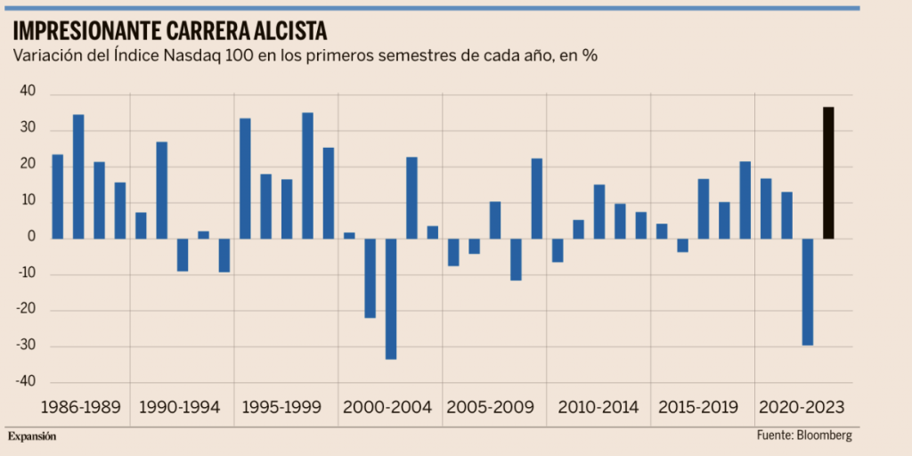 El Nasdaq 100 lleva una subida superior al 30% en lo que va de año teniendo el mejor primer semestre de su historia. El Nasdaq Composite, que es más amplio, se ha revalorizado casi un 30% y ha firmado su mejor arranque semestral desde finales de los 90. La fiebre por la inteligencia artificial (IA) y un entorno de tipos de interés en Estados Unidos, que se estima que está cerca de su techo, ha dado alas a las tecnológicas. La última encuesta de gestores de fondos realizada por Bank of America mostró que los inversores profesionales mantienen una elevada exposición a los valores de tecnología. Aunque la semana pasada ya se detectó una salida de dinero del sector tecnológico. Se retiraron 2.000 millones de dólares, la mayor cifra en diez semanas. Pero en las ocho semanas anteriores, las tecnológicas habían atraído más de 19.000 millones. El rally de la tecnología, que se aceleró con la quiebra de varios bancos regionales americanos el pasado marzo, lleva semanas cuestionado por algunas firmas de inversión, que esperan una fuerte corrección. Pero podría ser una pausa para seguir al alza a largo plazo. La fuerte subida de las cotizaciones ha dejado el listón muy alto para la temporada de resultados y el riesgo de decepción es mayor. Aumenta, por tanto, la probabilidad de caídas. Valores como Nvidia y Meta suben más del 130% este año, y Tesla ronda el 100%, lo que obliga a ser cautos. Julio suele ser un mes alcista para el Nasdaq, el año pasado se anotó un 12,55% (tras caer un 9% en junio de 2022), pero en los últimos 15 años el índice tecnológico ha subido en julio.