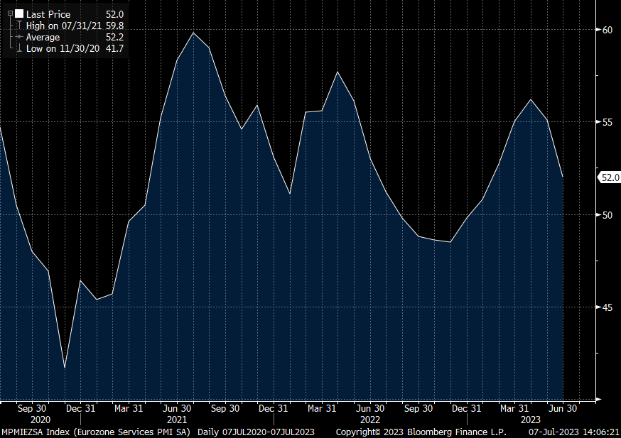 El martes se publicaron datos de confianza empresarial en China que decepcionaron. En concreto, conocimos el PMI de los servicios realizado por Caixin que bajó más de lo esperado en junio al situarse en niveles de 53,9 desde el 57,1 anterior. Aunque este indicador sigue cómodamente en terreno de expansión económica, el freno registrado en junio apunta a un menor dinamismo de la actividad del sector en los próximos meses. Con este freno en la confianza de los servicios, el PMI compuesto de la economía se sitúa ahora en el 52,5 frente al 55,6 anterior.