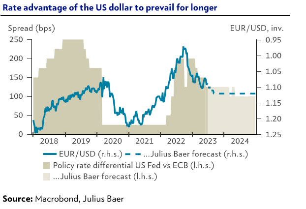 El cambio de expectativas sobre tipos de interés le resta al dólar espacio para depreciarse de aquí a final de año frente al euro, esta semana Julius Bäer rebajaba su objetivo a 1,12 dólares por euro a 12 meses frente al 1,15 que esperaban anteriormente