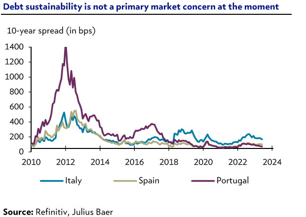 La mezcla de fuerte recuperación económica tras el Covid y alta inflación ha reducido marcadamente los ratios de deuda sobre PIB gracias a un aumento del numerador (PIB nominal). De aquí en adelante el camino es menos claro con menores crecimientos e inflación no van a ayudar, el pago de intereses van a ir aumentando y la deuda no va a poder bajar rápidamente. De momento, como muestran los diferenciales de crédito, el mercado no está preocupado al respecto.