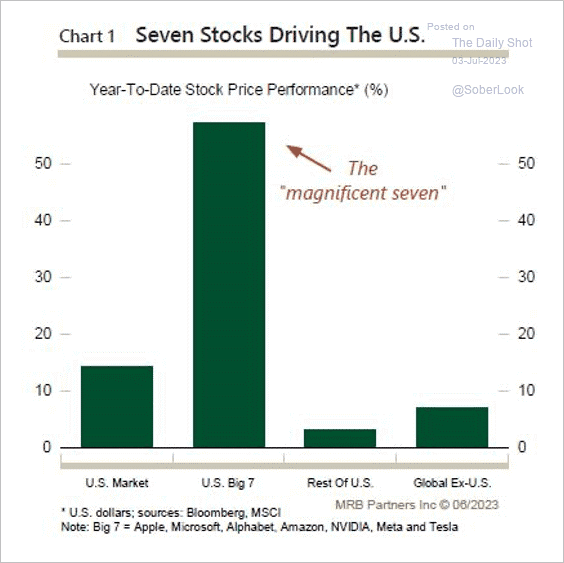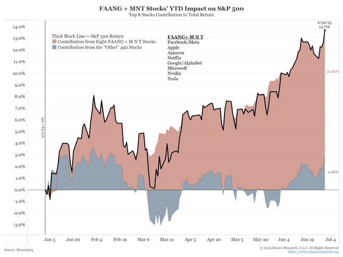 El Nasdaq cayó ayer un 2%, parece que empiezan a preocupar las valoraciones a las que cotizan las grandes compañías y las tecnológicas en Estados Unidos, además de que nos acercamos a un mes complicado por su falta de liquidez, como es Agosto, veremos cómo viene la temporada de resultados del segundo trimestre del 2023, que será lo que marque la evolución de las Bolsas en las próximas semanas, las grandes tecnológicas lastraron las Bolsa americanas ayer, con el sector salud (+1,6%) haciéndolo mejor tras unos buenos resultados de Johnson & Johnson (+6%) y el anuncio de que la compañía lanzará un split por su división de productos sanitarios de consumo Kenvue. Ayer Tesla cayó un 10% y Netflix un 8,50%.