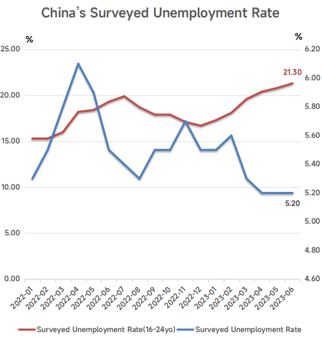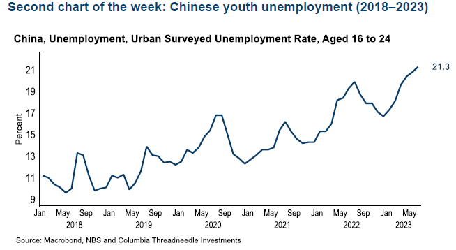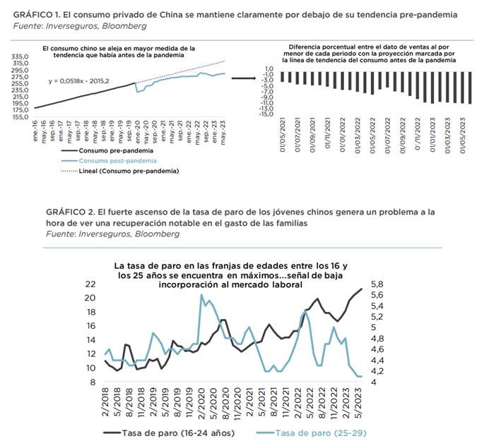 El lunes se publicó el dato de crecimiento del PIB del 2T23 en China. La economía China perdió impulso en el segundo trimestre de 2023, con un crecimiento del Producto Interno Bruto de tan solo un +0,8%. Este crecimiento es menor que en primer trimestre del 2023 debido a la caída de las exportaciones, las débiles ventas minoristas y el estancamiento del sector inmobiliario. Aunque la tasa de crecimiento del segundo trimestre fue algo más fuerte de lo esperado, superando el pronóstico del 0,5% en una encuesta de analistas de Reuters, fue también más débil que el crecimiento del 2,2% reportado en el 1T23. En términos interanuales, la economía China crece en estos momentos a una tasa del 6,3% hasta el segundo trimestre, debido principalmente al efecto de una base baja del año pasado, cuando ciudades importantes como Shanghái estuvieron bajo bloqueo y confinamiento durante un período prolongado. La encuesta de Reuters y la mayoría de las analistas pronosticaban una tasa de crecimiento interanual en el entorno del 7,3%. Las dificultades a las que se enfrenta la segunda economía más grande del mundo ejercerán cada vez una mayor presión sobre el crecimiento global y aumentarán las llamadas para que Pekín intensifique las medidas de estímulos, más de seis meses después de que China abandonara los estrictos controles por el Covid-19. El desempleo juvenil también alcanzó un máximo del 21,3% y se espera que aumente en los próximos meses a medida que se gradúen más estudiantes. Crece el descontento entre los jóvenes por la falta de empleo, y cada vez son más los que se manifiestan en Internet, lo que puede provocar malestar social si la política no da resultados.