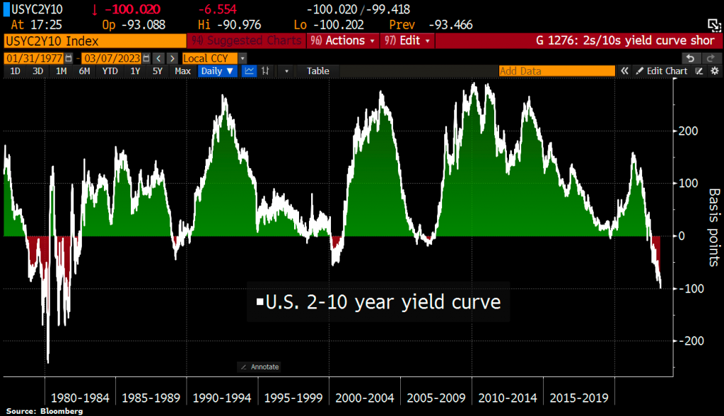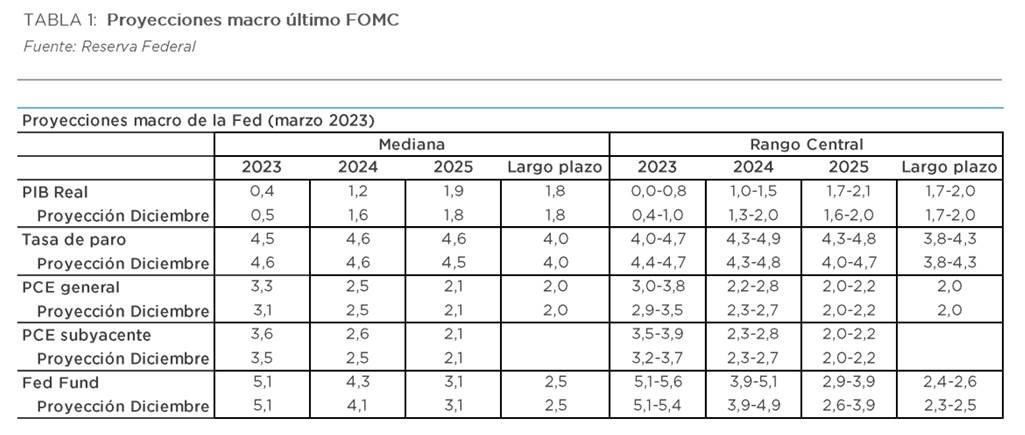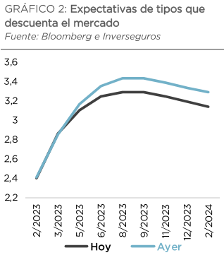 El miércoles la Fed, tras subir los tipos un 0,25% (hasta 4,5%-4,75%), en la conferencia de prensa de Jerome Powell ofreció un mensaje más optimista sobre la economía que alimenta la tesis del aterrizaje suave de la economía americana y por primera vez habla del inicio de un ciclo deflacionista. Powell dijo que no espera que haya un incremento significativo de paro mientras la inflación vuelve al 2%, aunque habló de que es prematuro cantar victoria, indicó que el proceso desinflacionista ya se ha iniciado, especialmente en bienes, uno de los factores más relevantes sigue siendo la fortaleza del mercado laboral con datos como el de esta semana que vuelve a situar el ratio nuevas vacantes/desempleados cerca de máximos. El mercado espera subida adicional de 25 puntos básicos en la próxima reunión hasta un techo de 5%, y posteriormente una bajada inmediata de tipos de 50 puntos en la segunda mitad del año.